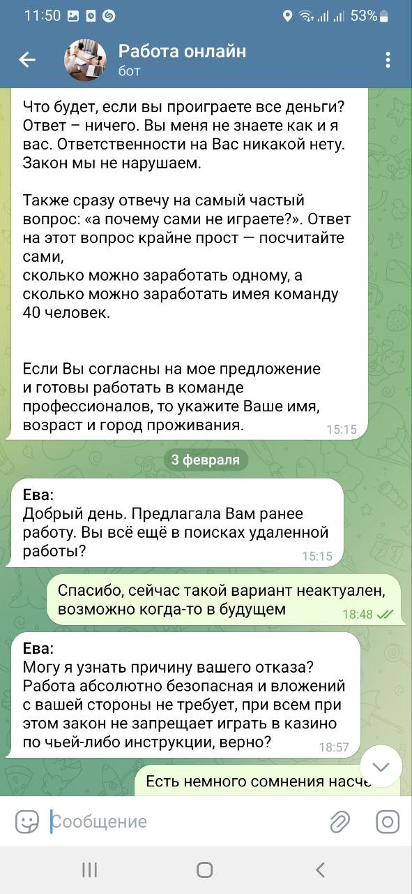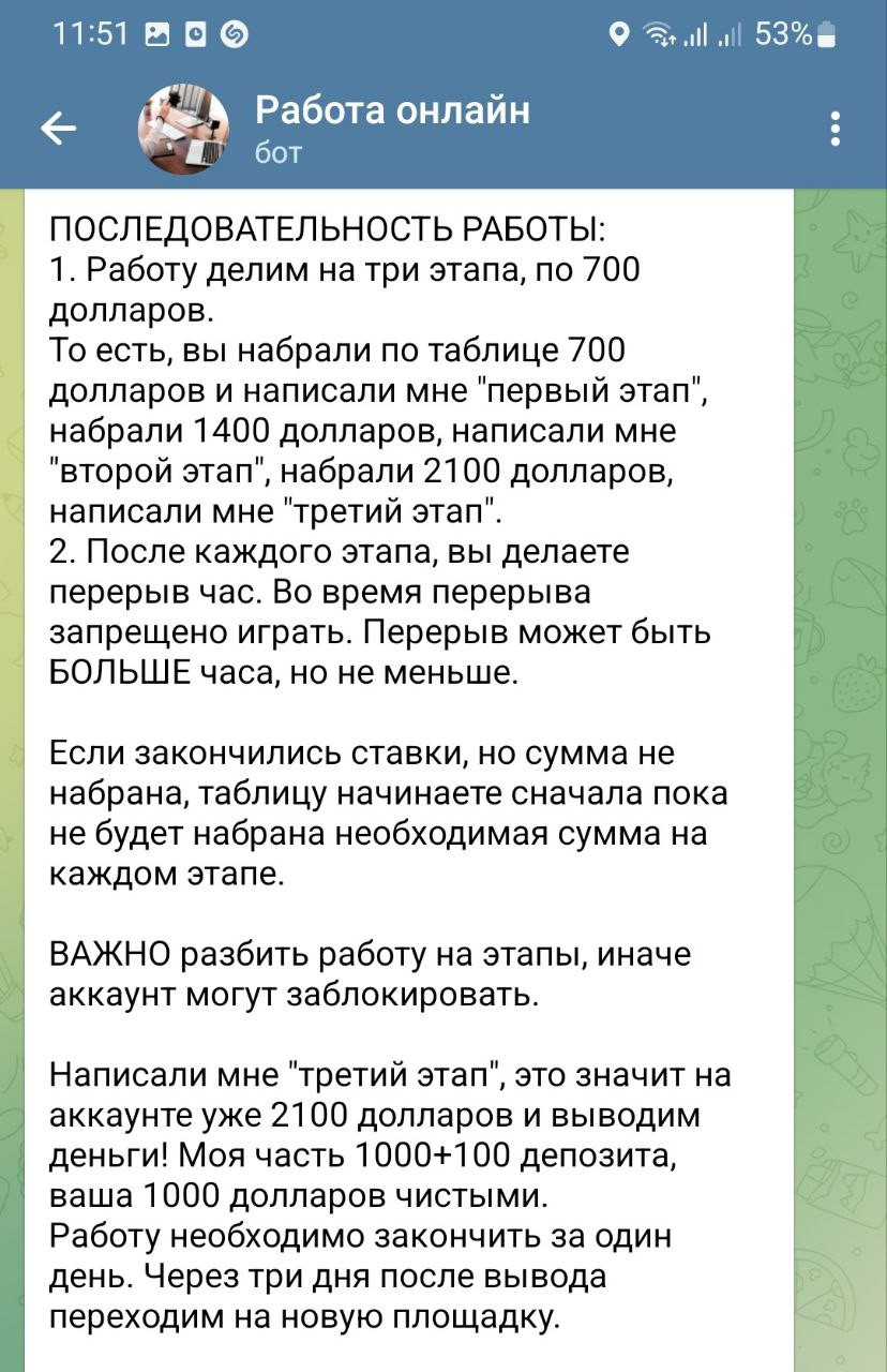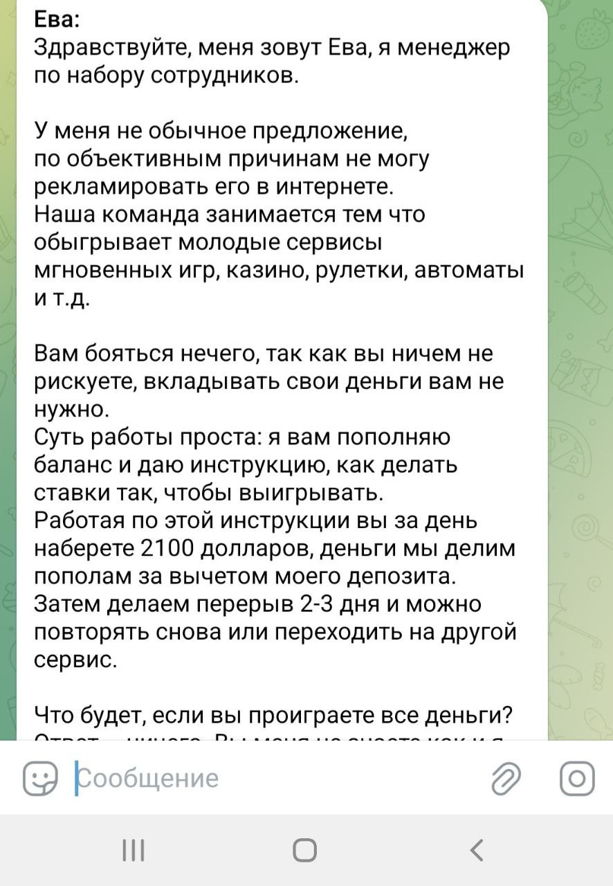 Виктория наткнулась на рекламу работы онлайн в Instagram с ежедневными выплатами. Спустя время уже в Telegram ей пришли подробности о сути работы. Предложили (всего лишь) обыграть онлайн-казино, следуя определенным стратегиям. «На то оно и казино, чтобы не рандомно тыкать на кнопочки, а стараться опираться хотя бы на какую-то логику и теорию вероятностей», — подумала девушка. Ведь делать ставки в определенной последовательности не запрещено законом. Она ввязалась в эту авантюру, забыв про золотое правило: казино всегда в плюсе, тем более если оно создано мошенниками.