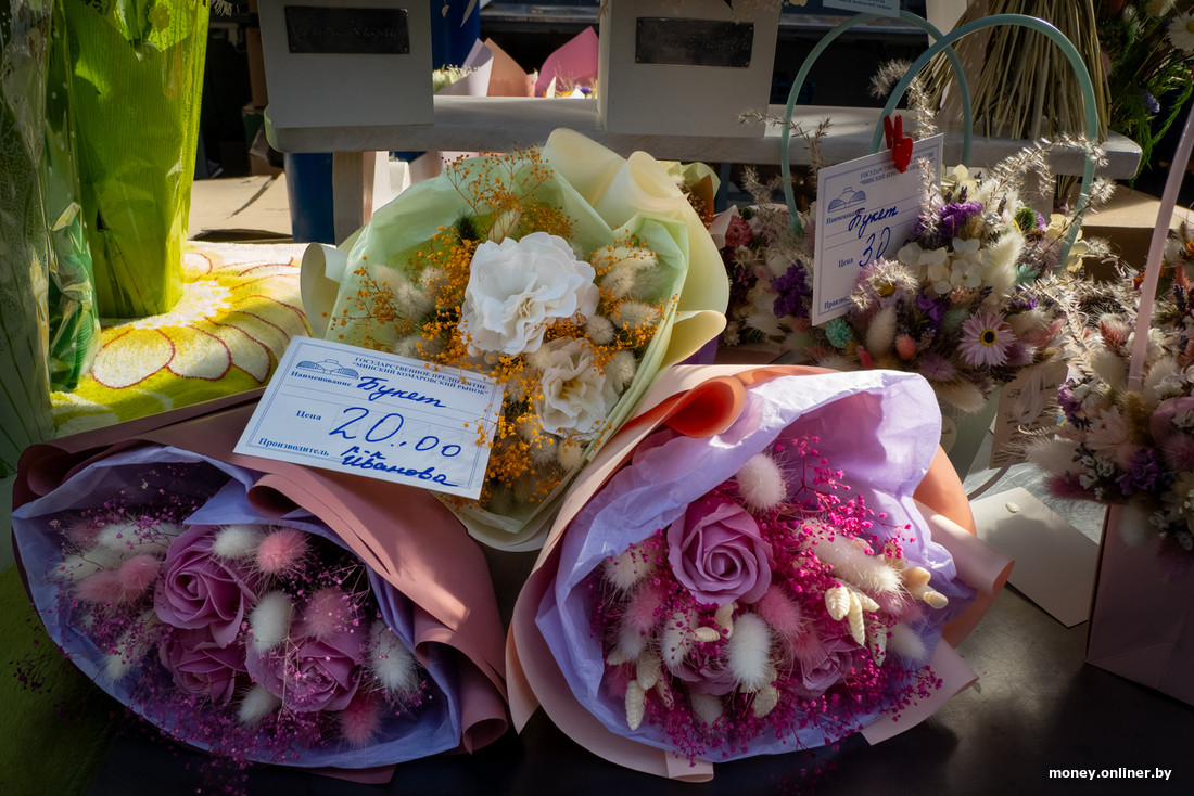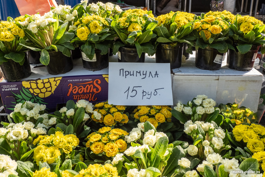 Недалеко от рынка цветы продают все желающие. В этом году физлицам Мингорисполком согласовал почти 200 торговых точек, вот список адресов в каждом районе. Подходим к одной из них узнать, как идут дела и кто покупает тюльпаны. «На офисы берут, для любимых женщин берут», — говорит продавец. Тюльпаны у нее по 4 рубля — из Пинска, там теплицы. На вопрос, сколько простоят, пожимает плечами.