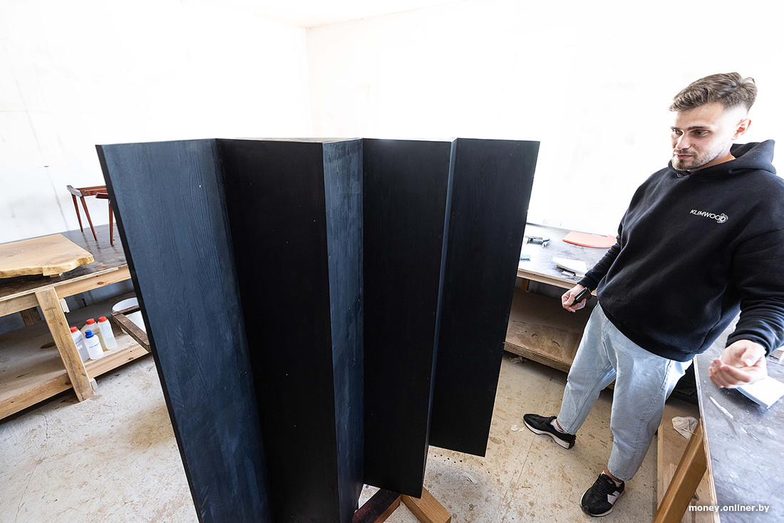 — Процесс непростой: берешь машину с прицепом, загружаешь, везешь в Гродно, выгружаешь — все это требует времени и денег. Можно, конечно, купить уже термированное дерево, но каждый слэб уникален и не все материалы есть в Беларуси. Стулья, табуретки — мы делаем все, что касается дерева. Человек купил квартиру, ищет комод, шкаф в едином стиле, в голове видит рисунок, а найти не может. К нам приезжают с фантазиями, и мы составляем эскиз, — рассказывает Роман.