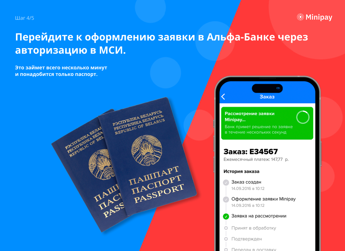Первый платеж по рассрочке Minipay, как и по кредиту, ноль рублей. Погашается Minipay со следующего месяца. Оформление происходит полностью онлайн, а заявки «Альфа Банк» рассматривает в большинстве случаев за считаные секунды.