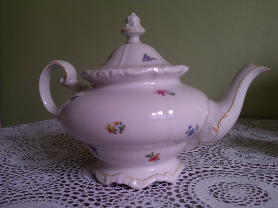 Автор формы «Новгородская» — Эдуард Криммер, автор рисунка — Алексей Воробьевский. Ленинградский фарфоровый завод, 1960-е годы. В комплект входят заварной и доливной чайники. Такой комплект можно выставлять по цене от 250 рублей.