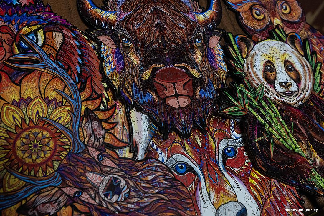 Самым первым пазлом стал зубр — символ Беларуси. Спойлер: это до сих пор самая продаваемая мозаика бренда. Вместе с ней появились филин и рысь, которые вышли на рынок сразу после зубра. После краснокнижных были и другие животные, а затем и работы совсем другой тематики. Подробнее рассмотрим их в мастерской.