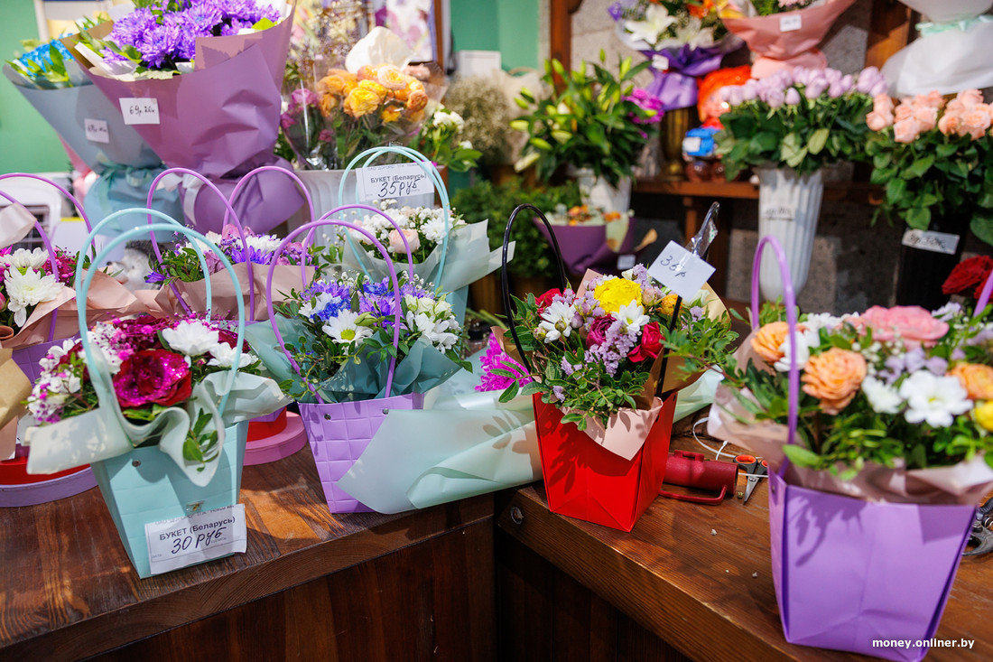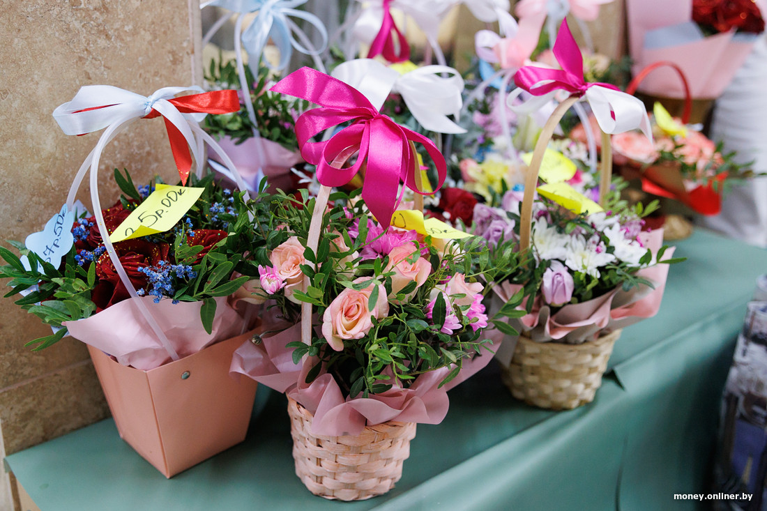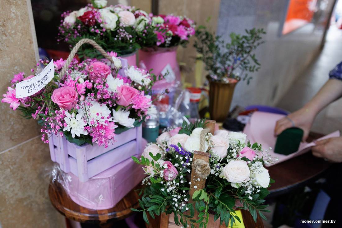 По словам продавцов, особенным спросом пользуются цветы в коробках и корзинках — такие букеты выглядят компактно, нарядно, и их удобно нести.