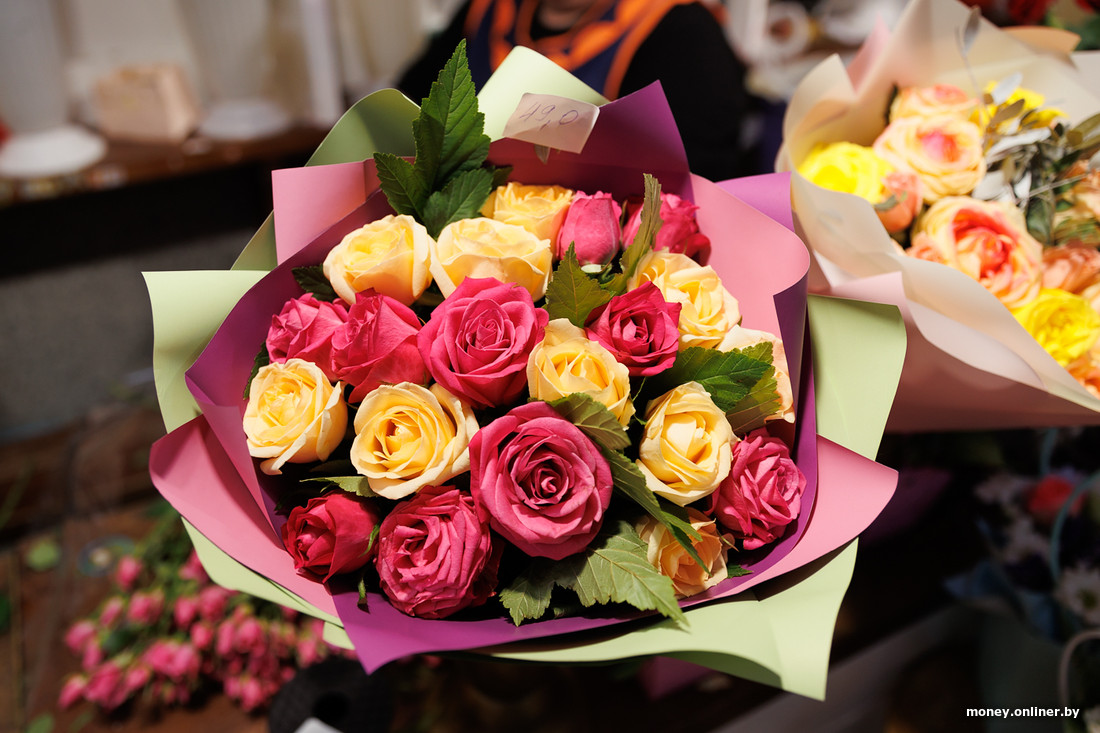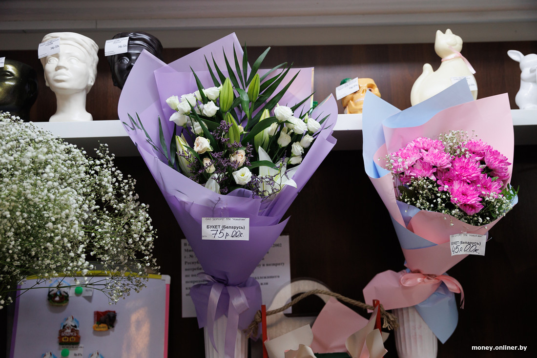 Среди ассортимента выделяется обилие роз — и чайные, и алые, и белые. «Это наши, дорорсовские», — говорят нам в нескольких павильонах. На ценниках у этих цветов встречаются такие цифры: 50 см — 3 рубля, 60 см — 3,50 рубля, 70 см — 4 рубля.