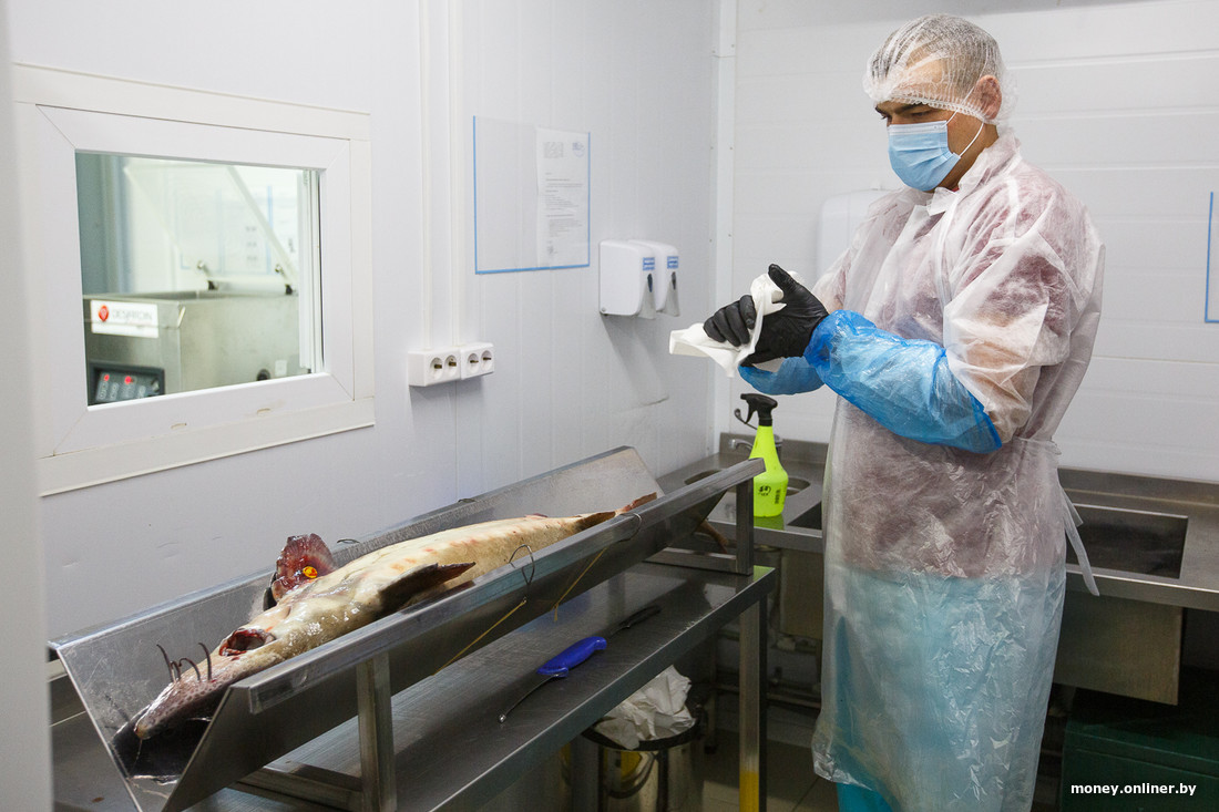 Чтобы дождаться икры от самки осетра, надо запастись терпением лет на семь-десять. Хорошим «урожаем» будет 10% икры от веса рыбы. Средний вес осетра — от 8 до 10 кило (но бывают и гиганты под 17!). То есть с одной рыбы можно получить килограмм черной икры. Здешних осетров выращивают за рубежом, а потом, когда рыба уже подросла, доставляют в Фаниполь. В Беларуси она проведет свои последние два-три месяца — пока не наберет нужную форму.