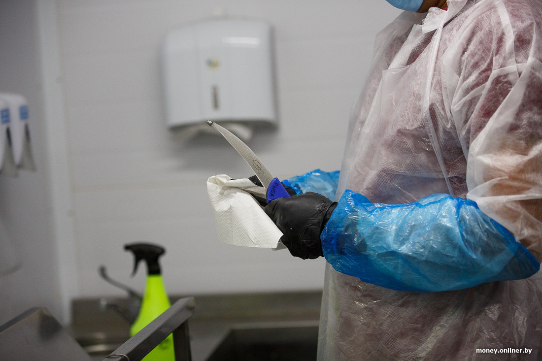 Одним из главных моментов на производстве черной икры оказалась стерильность: здесь, говорят, чистота важнее, чем в операционной. Прежде чем мы шагнули внутрь, нас «упаковали» в халаты и шапочки. Выглядели мы, конечно, как начинающие хирурги, но правила есть правила: ни одна волосинка не должна оказаться рядом с икрой.