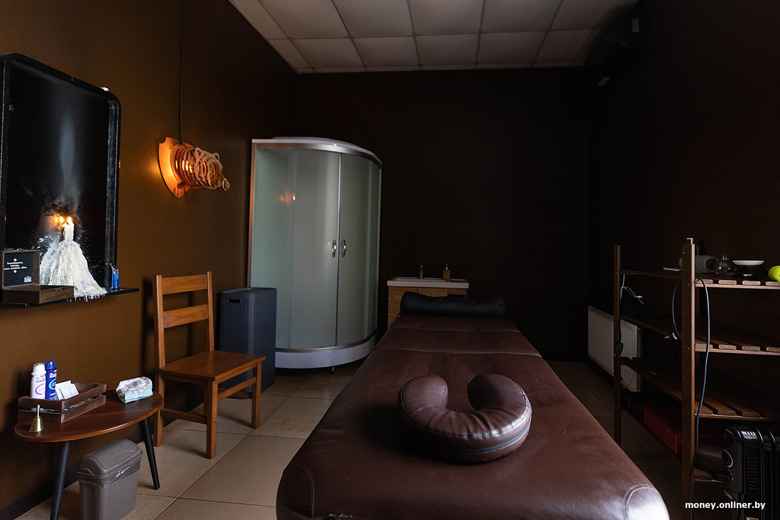 Первая локация, куда мы попадаем в Могилеве, — это мастерская массажа «Медвежья лапа». Хотя на часах около одиннадцати часов дня, здесь создается впечатление, что уже поздний вечер: в студии всегда приглушенный свет и зажжены свечи — все ради расслабления.