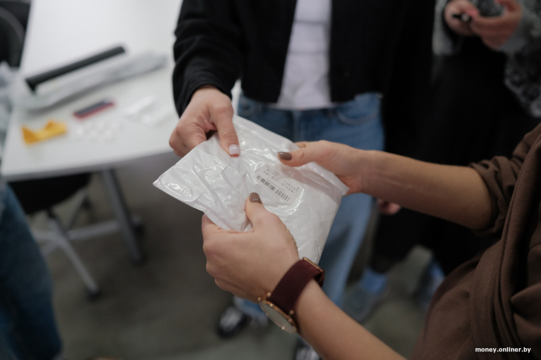 Навскидку пакетов, кульков и свертков разных размеров несколько сотен. Прямо сейчас в продаже есть лоты только за 10 рублей. Но объявления, расставленные по помещению, сообщают: можно претендовать на mystery box (загадочная коробка. — Прим. Onlíner) и за 50, и за 100 рублей. Именно они пользуются самым большим спросом, поэтому элитные «потеряшки» нам не достались.