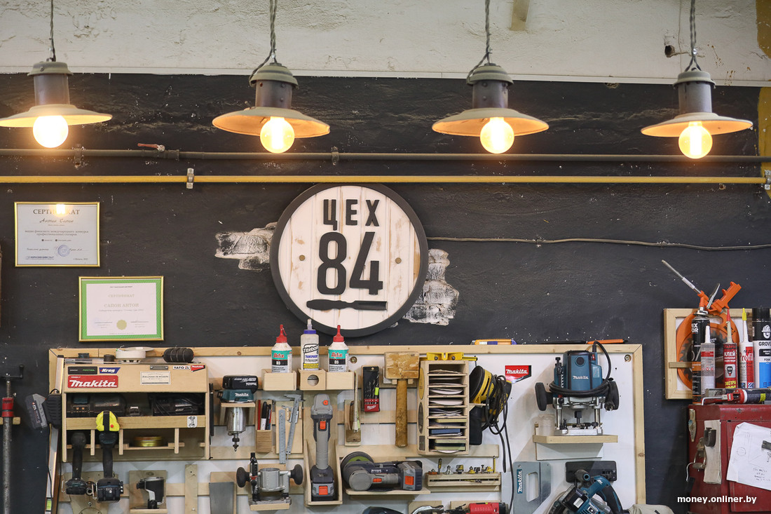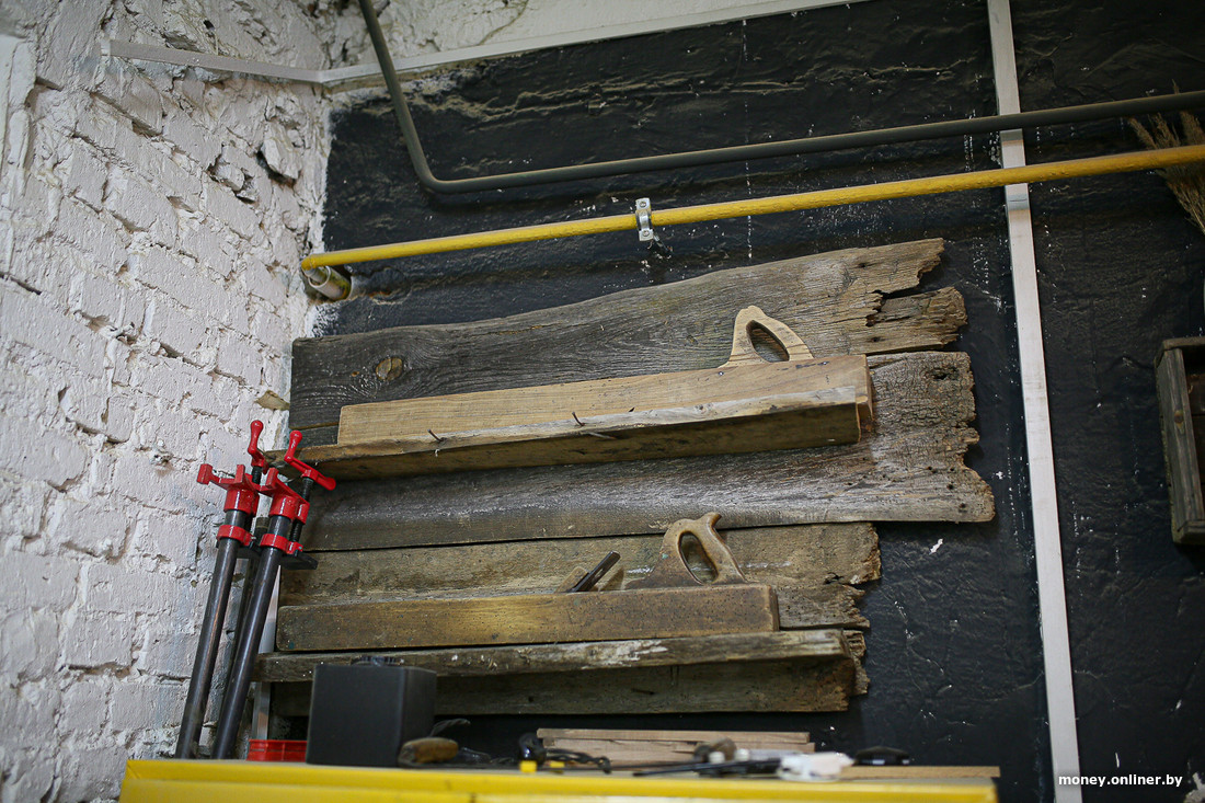 Но вернемся в «Цех». На одной из стен аккуратно развешаны инструменты: здесь и электрические лобзики, и дрели, и сверла. Под ними висят несколько рамок с сертификатами. В другой части мастерской стоят массивные дубовые доски, которые мастер буквально спас от гибели на свалке. На рабочих столах виднеются заготовки, скобяные детали и шаблоны. Есть самодельный ленточный станок, пылесос и фрезер.