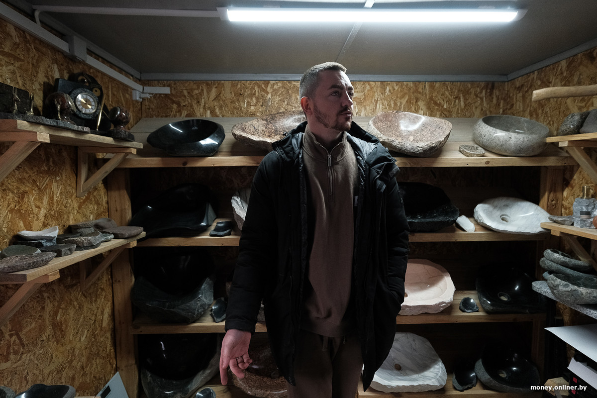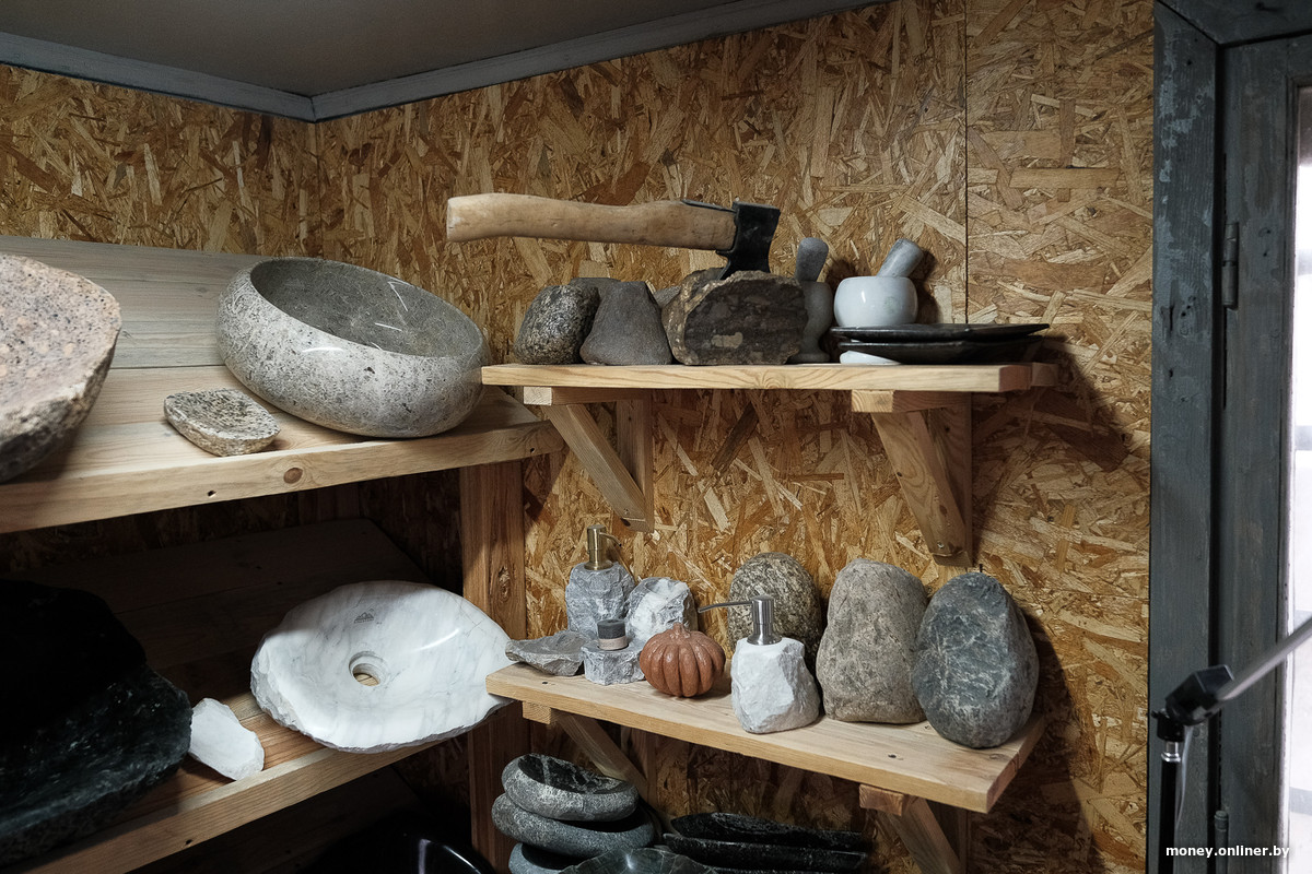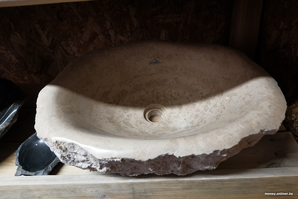 В его мастерской можно встретить мрамор с Урала, из Ирана и Италии, а также гранит из Индии. Но бо́льшая часть, конечно, наш камень. Закупает его мастер лично и фурами по 5—7 тонн. В одной тонне примерно 20—30 камней весом около 30 килограммов. Из одного камня можно сделать две раковины — если повезет и ничего не треснет. В среднем расходы на материалы составляют 20—30% от стоимости готового изделия.