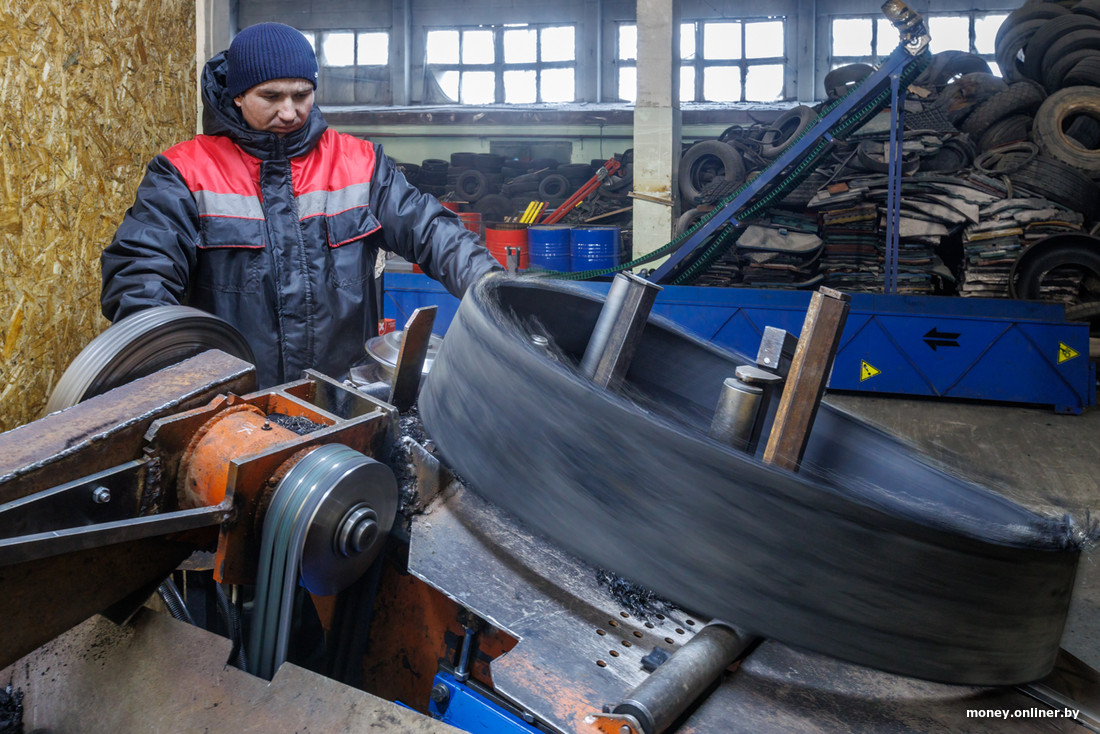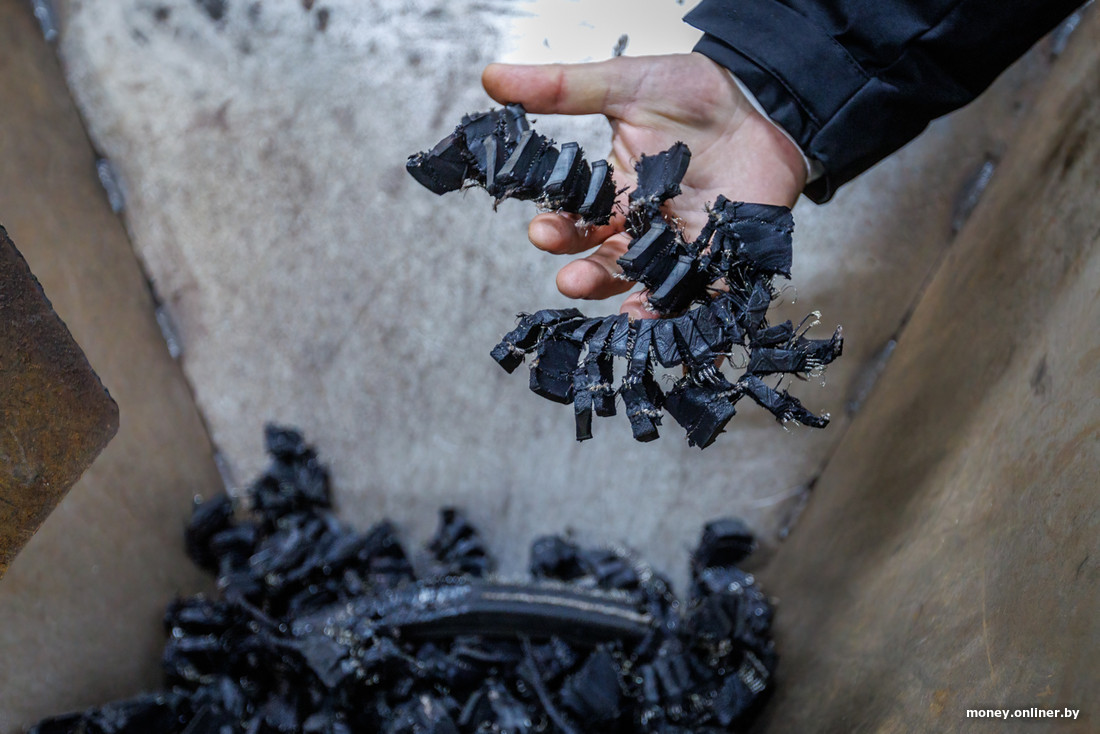 В цехе переработки они дробятся на отдельные части: металлический корд, текстиль и резину, которая дальше перерабатывается в мелкие фракции.