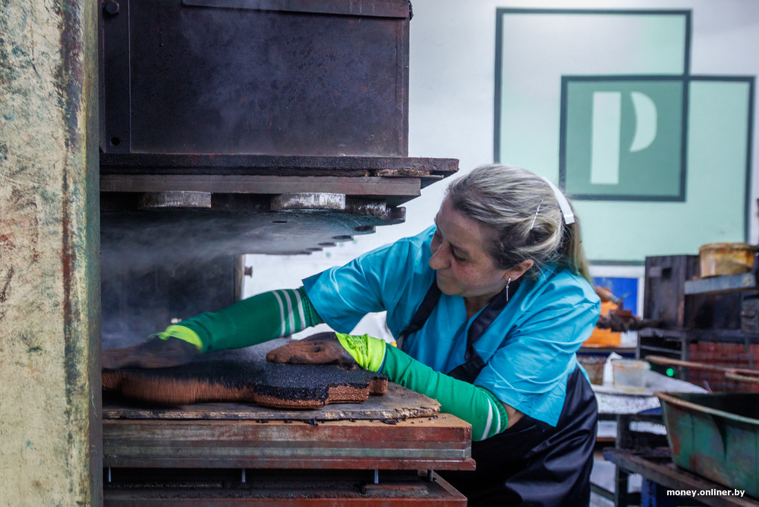 — На этом этапе резиновая крошка в определенной пропорции смешивается с пигментом в зависимости от выбранного заказчиком цвета, добавляется клей. Затем всю эту массу работники высыпают под горячий пресс, который нагрет до 170 градусов. Под воздействием температуры клей полимеризуется, — объясняет начальник цеха производства Николай Алинцинович. — Чтобы сделать одну плитку, уходит до 10 минут в зависимости от ее толщины.
