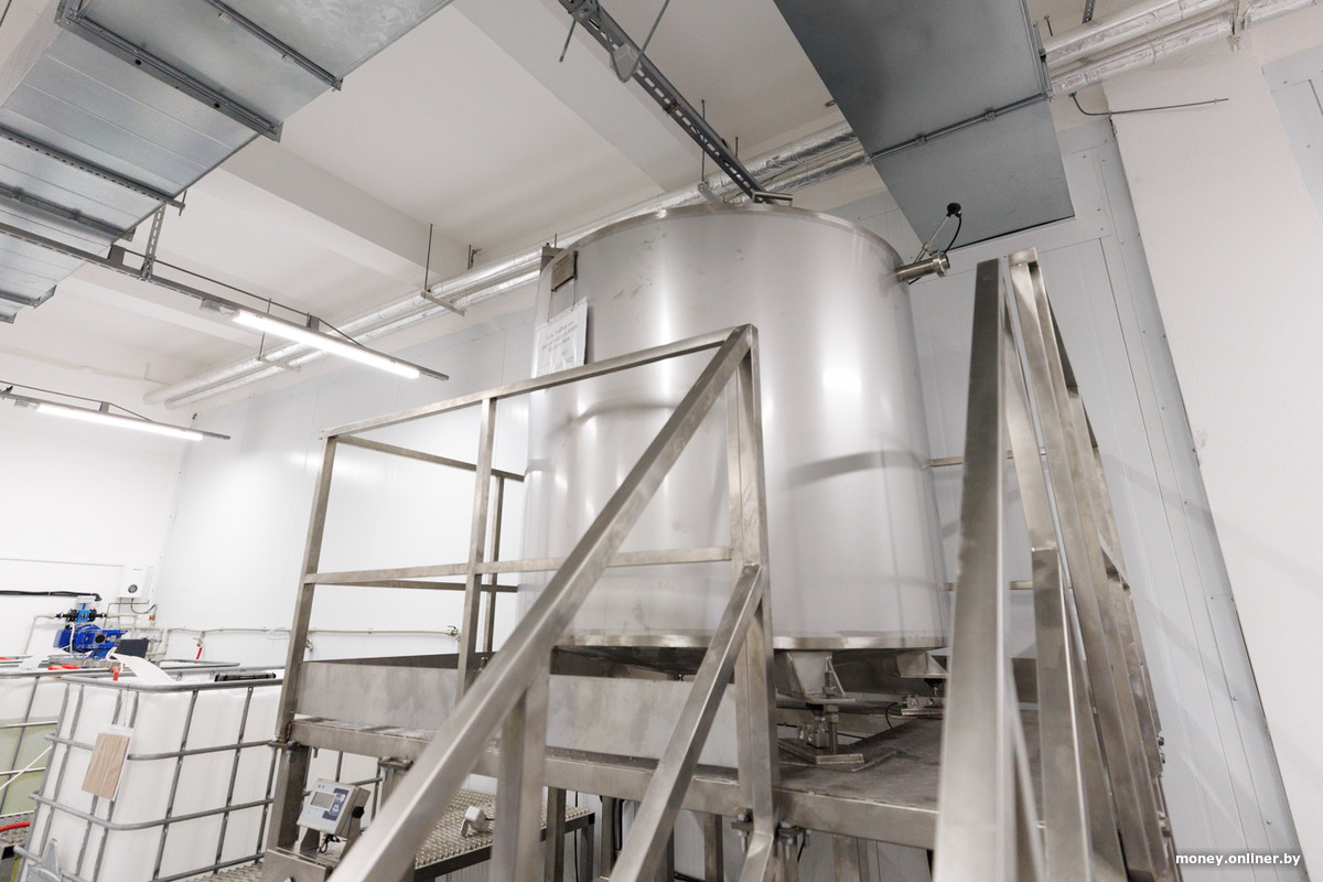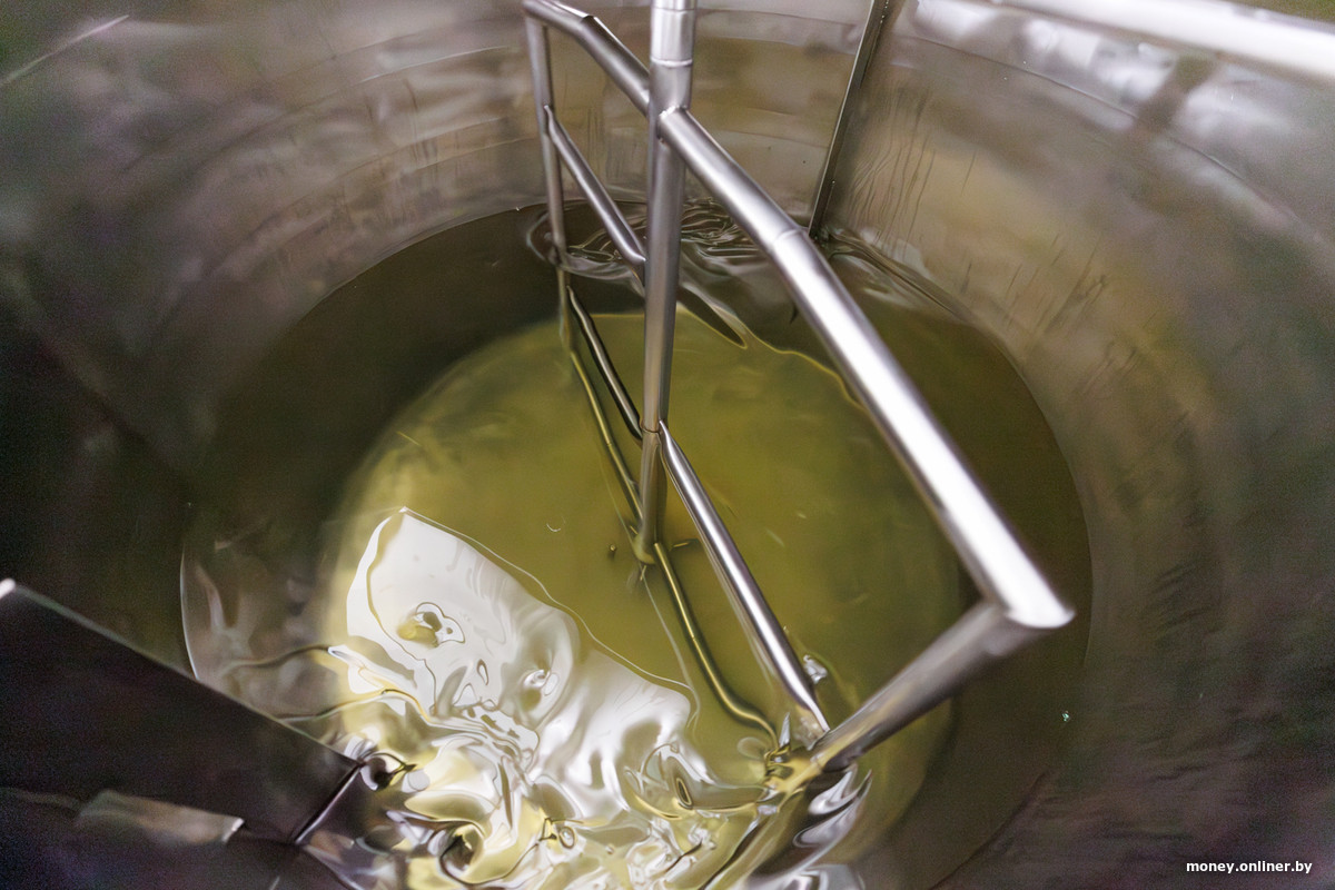 Рядом в цеху стоят большие пластиковые кубы — это, по сути, мини-версии большого металлического «блендера», в каждом свой вид продукции и аромат. Поставить большие металлические цистерны не позволяют масштабы производства, но руководство надеется к этому прийти: в планах вырасти из нескольких цехов в целый завод, расширить штат с 34 работников до 105—115 человек.