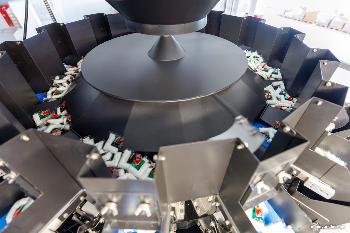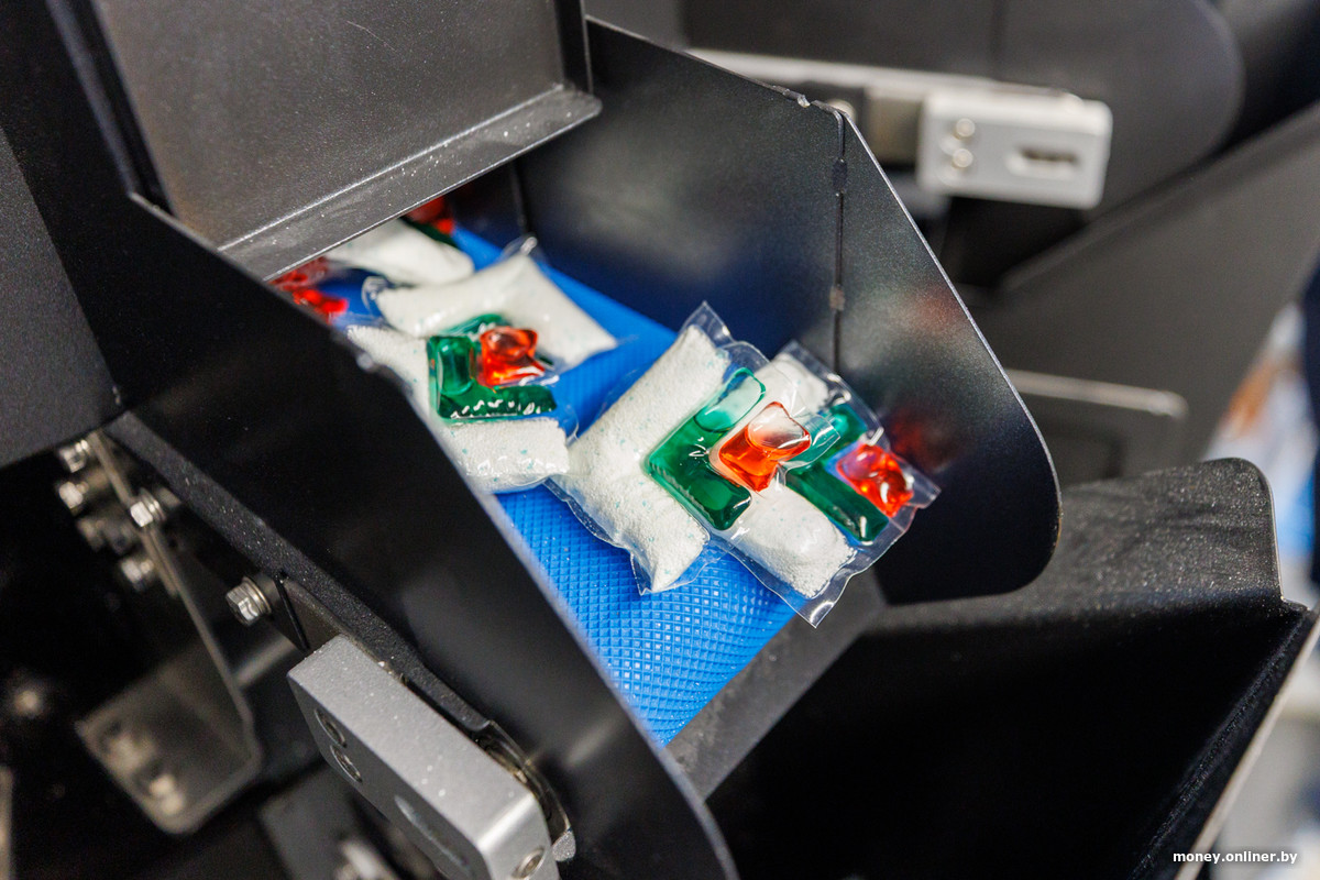 На другой линии в этом же цеху делают разноцветные капсулы для посудомойки. Нам рассказывают, что только моноблок, который придает им нужную форму, стоил порядка €1 млн. Во многом такая цена — из-за L-образной формы капсул: оборудование, которое делает классический квадрат, можно было купить в пару раз дешевле. Правда, квадратом сложнее выделяться среди аналогов, так что такая форма капсул — своего рода способ защитить торговую марку.