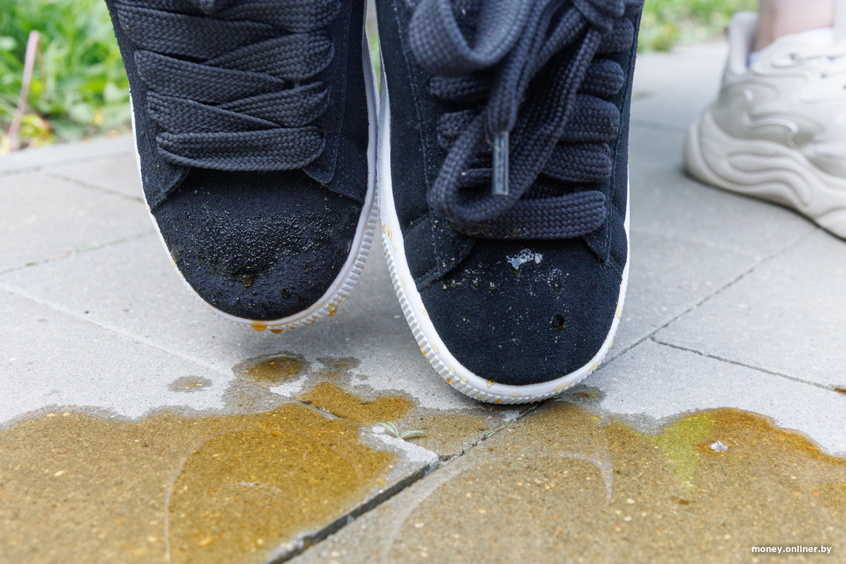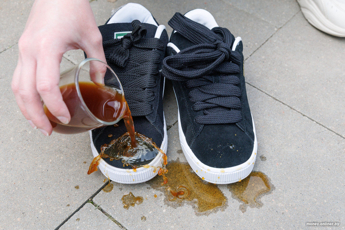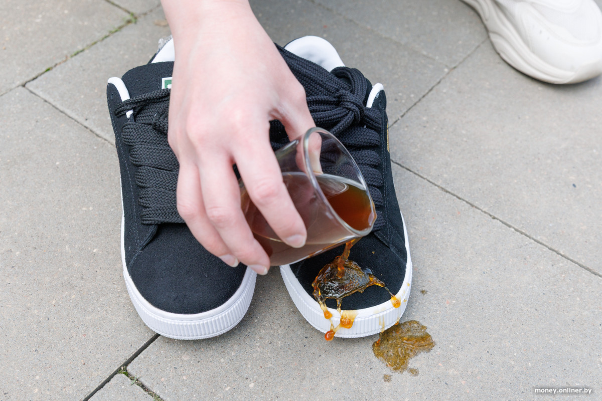 Рано или поздно любые кроссовки попадут под дождь. Но в момент съемки небо солнечное, так что идем на улицу с этой составной парой и чашкой американо. Льем кофе на носки — с замши капли скатываются быстрее, а с материала копии — медленнее, она быстрее намокает. Водоотталкивающей пропиткой, кстати, мы не пользовались.