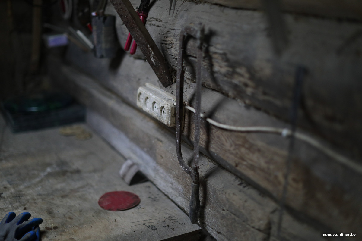 Потолки низкие, не поприветствовать балку лбом почти невозможно. Здесь стены из старых бревен, розетки, видавшие динозавров, тусклый свет, а по всему периметру разбрелись инструменты.
