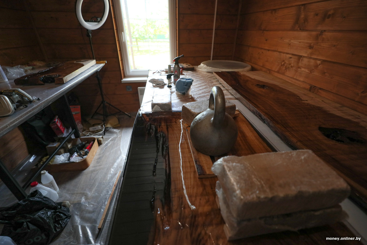 Сама заливка проходит не в мастерской — для этого Виталий выделил отдельную комнату прямо в доме. Раньше здесь, может, и стояла кровать, а теперь — столы, доски, банки со смолой и печка для поддержания нужной температуры. В помещении жарко, пахнет деревом и эпоксидкой, но, по словам Виталия, так и должно быть.