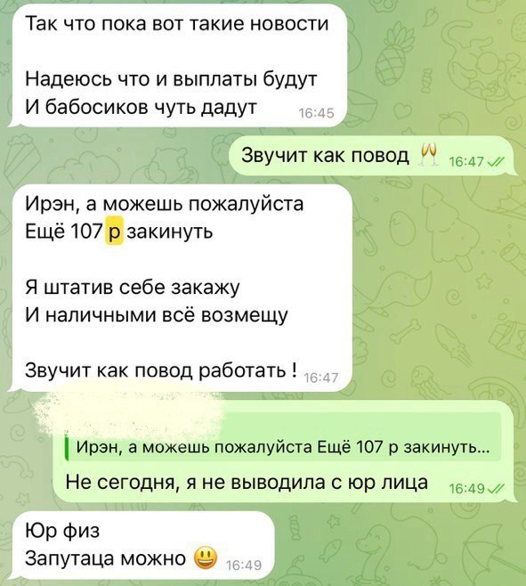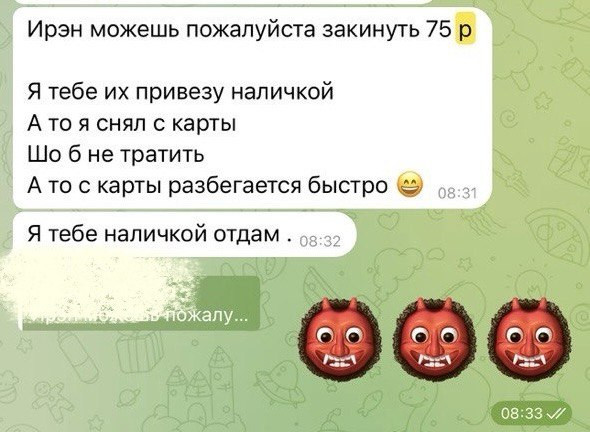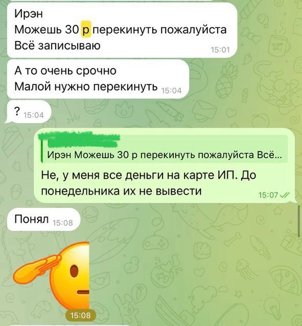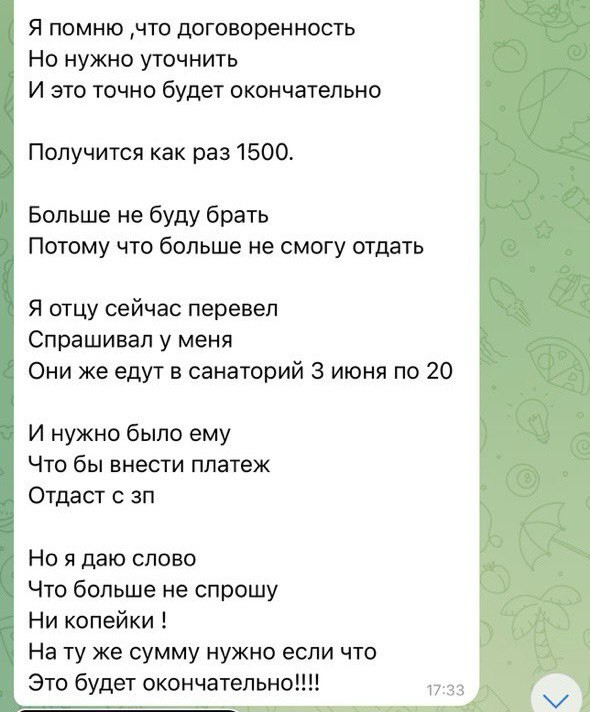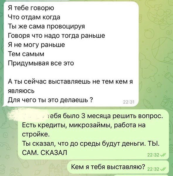 Я улетела на выходные, он все-таки остался. Мне как раз пришел рабочий перевод, все наладилось. И на тех же выходных история продолжилась. Он стал писать, что уехал к родителям, у них между собой там какие-то терки и ему нужно съехать, снять квартиру. Я снова перевела.
