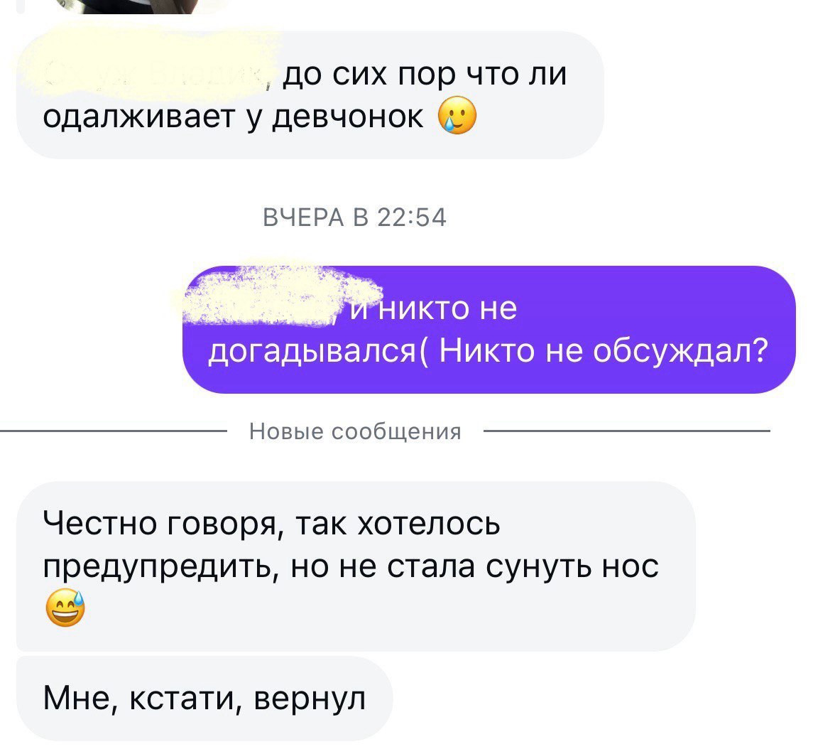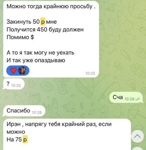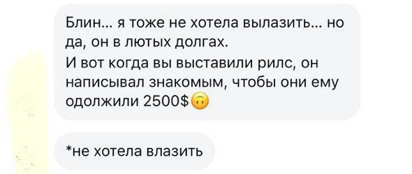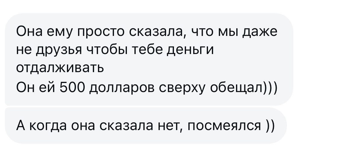 В какой-то момент я написала нашей общей подруге, мол, он у меня постоянно просит денег. Та ответила, что у нее тоже пытался просить, но постоянно натыкался на отказ и отстал.