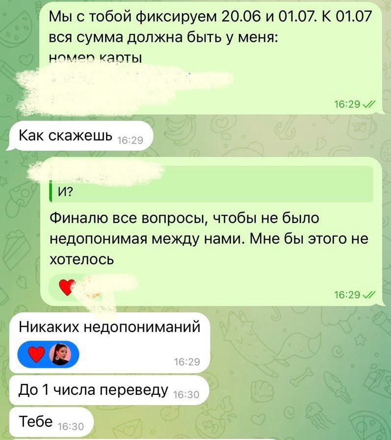 Хоть мы больше и не виделись после расставания, он продолжал кормить меня обещаниями. Что отдаст то 1 июля, то 15 июля, то 1 августа. Я для себя решила, что этих денег уже не увижу никогда. Я ведь по доброй воле их переводила — какой юридической защиты требовать в таком случае? Никаких расписок по долговым обязательствам не было.