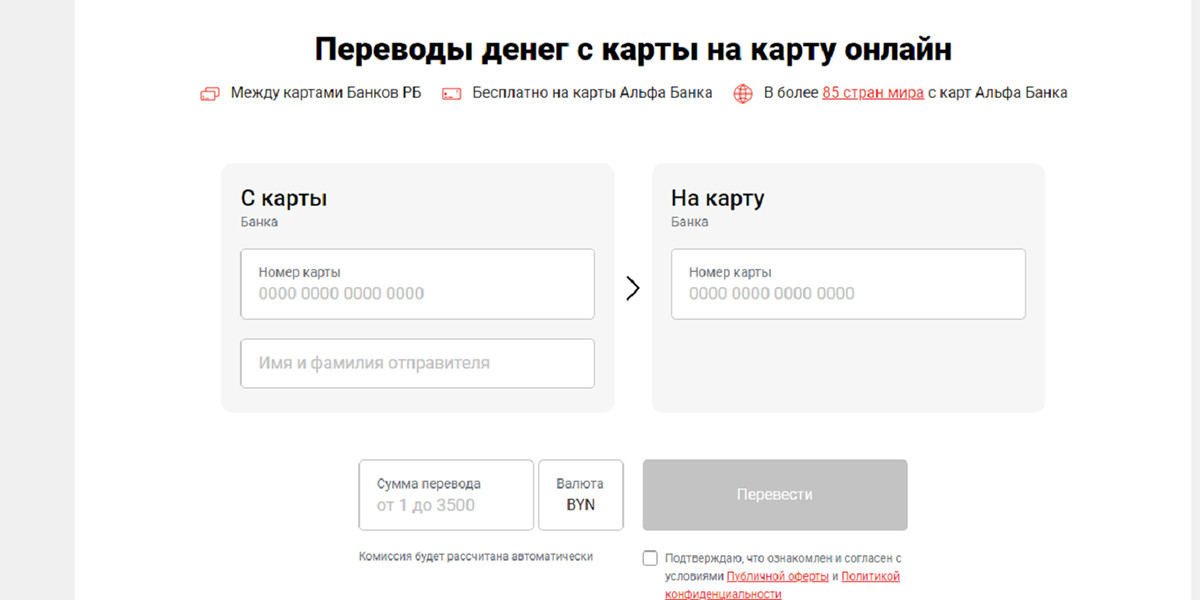 Для того, чтобы воспользоваться таким сервисом, достаточно ввести 16-значный номер карты отправителя, его фамилию и имя (либо срок действия карты и код CVV), а также номер карты получателя. При этом переводы доступны с использованием карт как в белорусских рублях, так и в иностранной валюте. Однако валютой операции во всех случаях являются белорусские рубли.