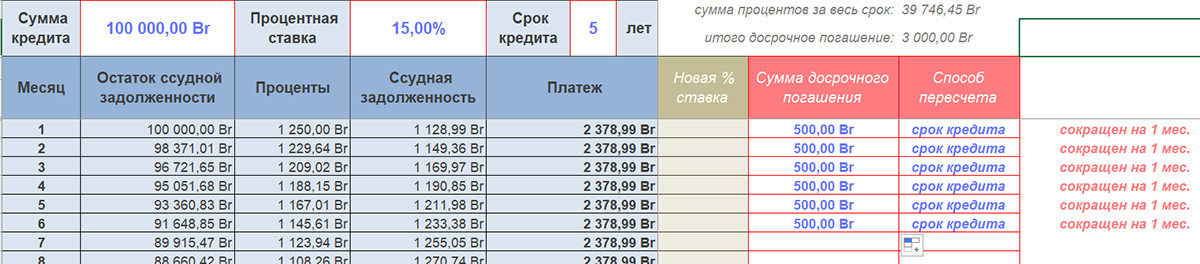 Теперь представим, что у заемщика появилась финансовая возможность платить не 2379 рублей, а на 500 рублей больше, то есть 2879 рублей ежемесячно.