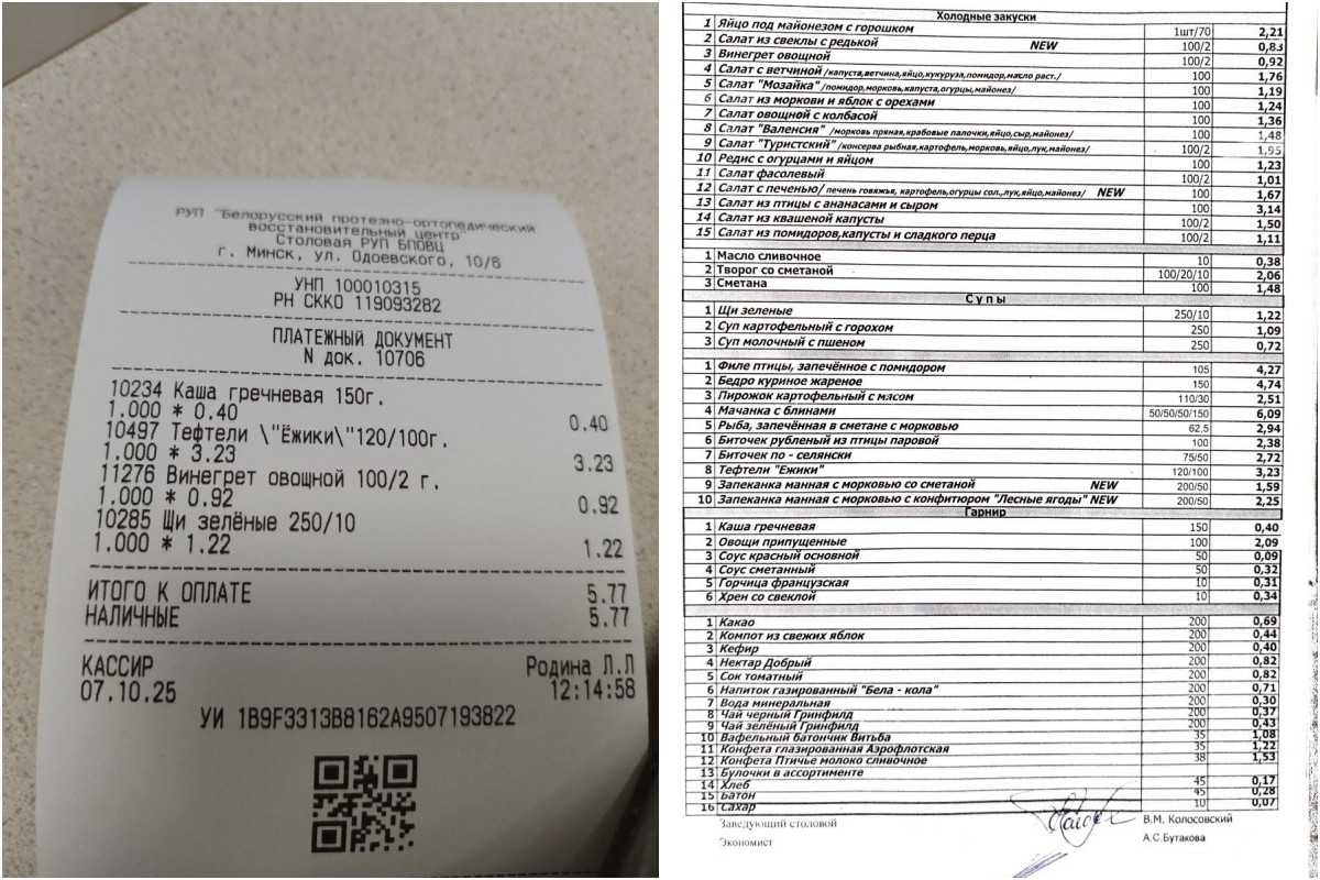 А это самый дешевый обед в сегодняшней подборке. «Был недалеко от РУП „Белорусский протезно-ортопедический восстановительный центр“ на Одоевского, 10/6, заехал в их столовую, пообедал за 5,77 рубля. Еда на вид не ресторанная, но вполне питательная», — написал Александр. Столовая работает с 10:45 до 14:00.