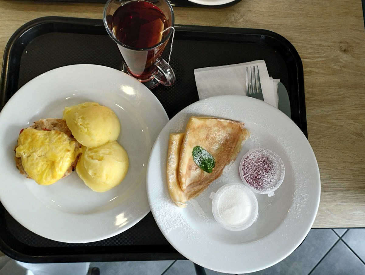 В «Столовой 12» за 15 рублей можно взять такой набор: куриная котлета с помидором и сыром, пюре, блинчики с джемом и вареньем.