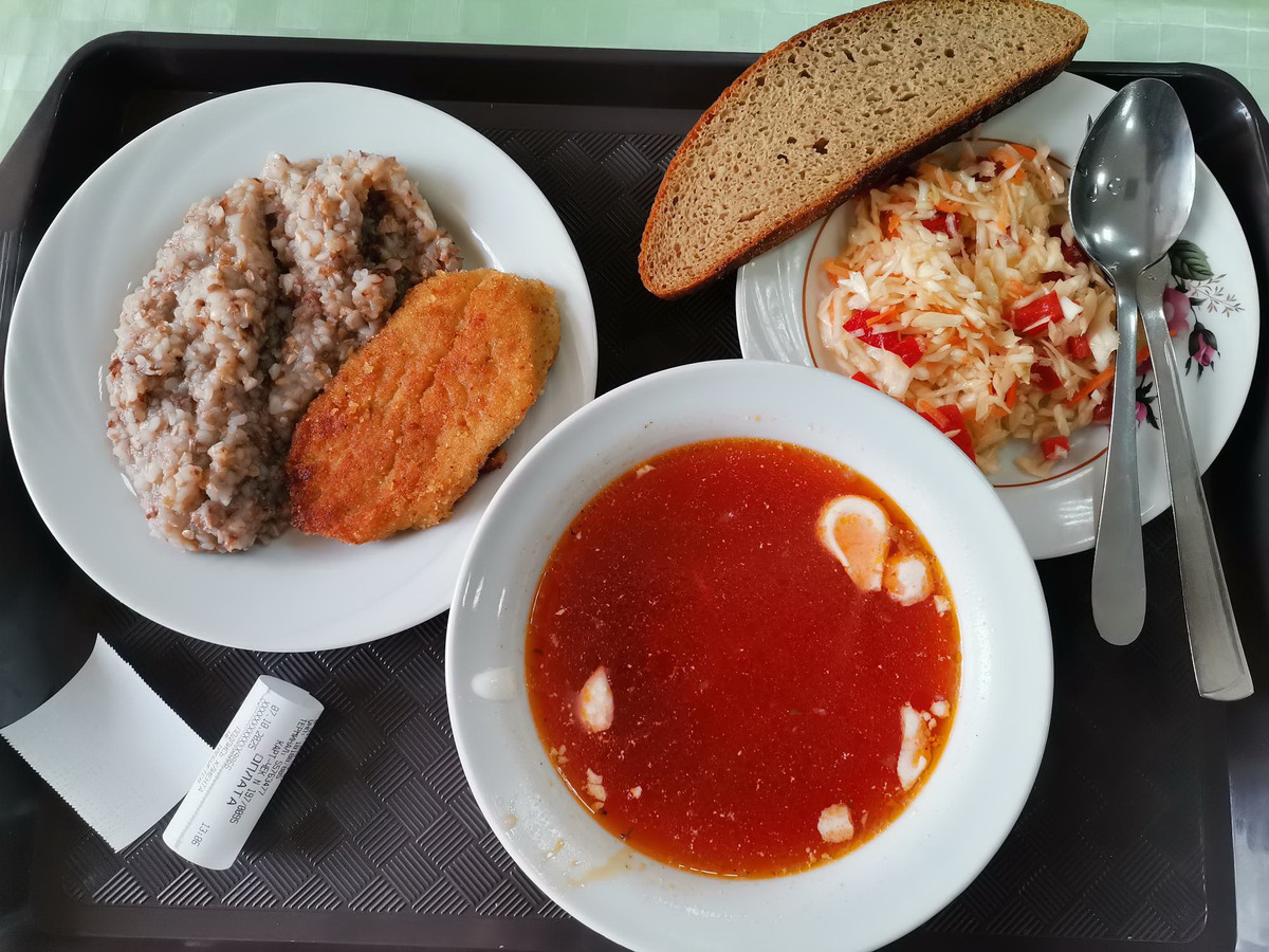 «Борщ — 1,16 рубля, гречка с куриной котлетой — 0,57 плюс 3,33, салат с капустой и перцем — 1,65, хлеб — 0,22. Итого — 6,93 рубля. Все вполне съедобно, — рассказывает читатель. — Из минусов — всегда скудный выбор блюд. Суп — два вида, мясное — три-четыре вида, гарнир — один-два вида. Очень редко бывает картошка. Но на сегодня пообедать за 7—8 рублей (если взять салат побогаче и мясное типа куриного филе или эскалопа) — это вполне достойная альтернатива. Дешевле, наверное, только в школьных столовых, и то не факт. И, опять же повторюсь, все вполне съедобно.