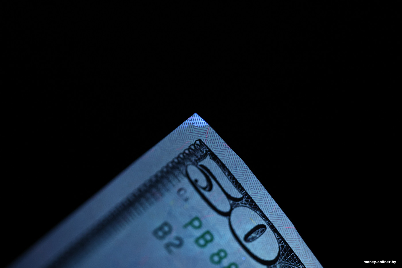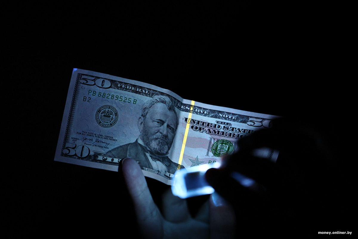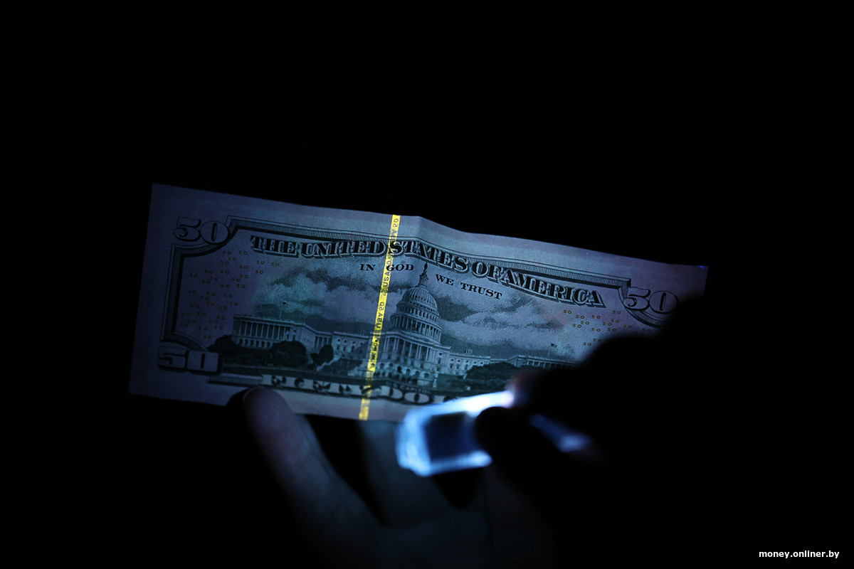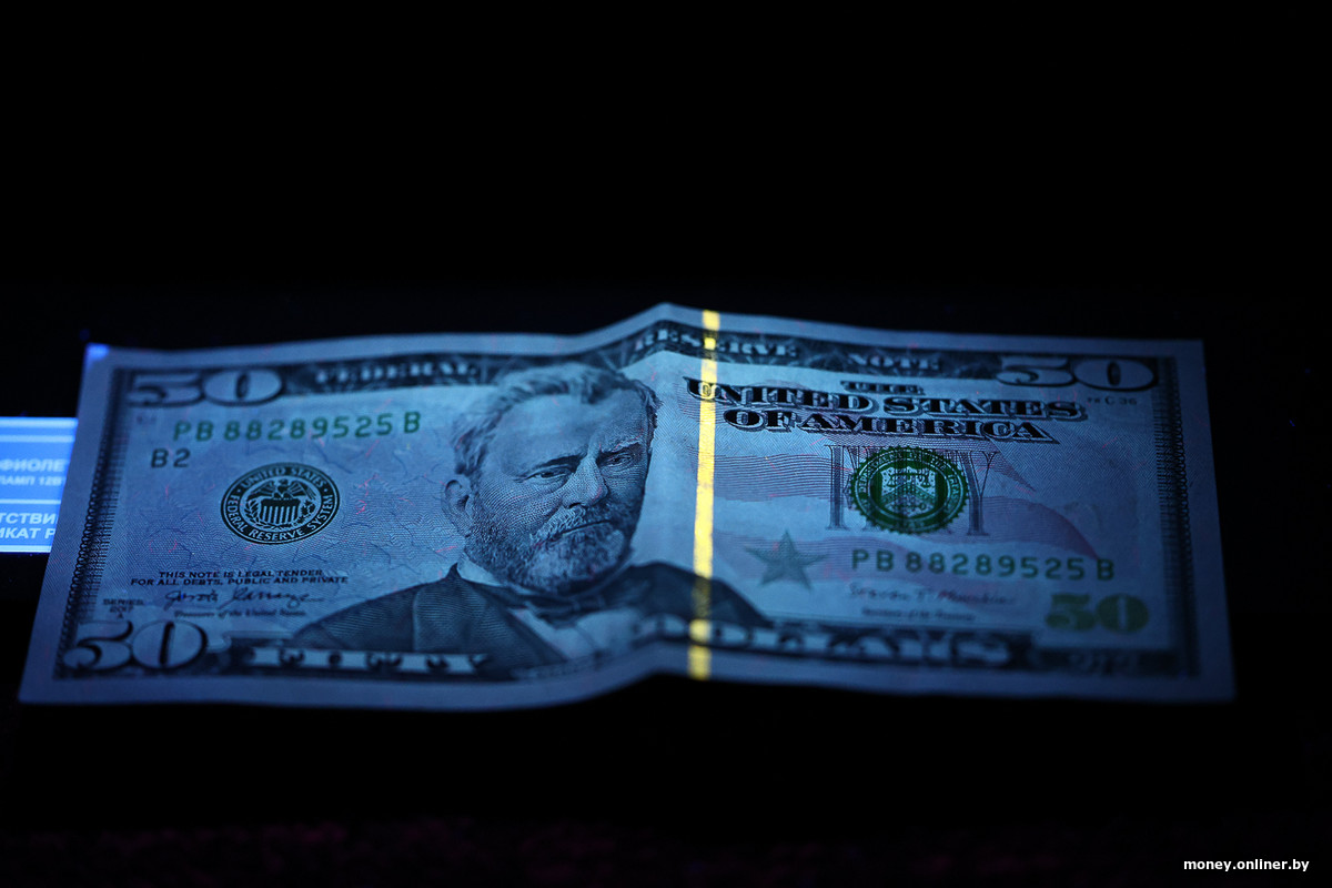 Чтобы результат был более заметным, отправляемся проводить опыты в темную комнату. И начинаем с другой купюры, без статуса «подозрительная». Эту купюру в $50 ее владелица купила в одном из отделений «Беларусбанка» летом.