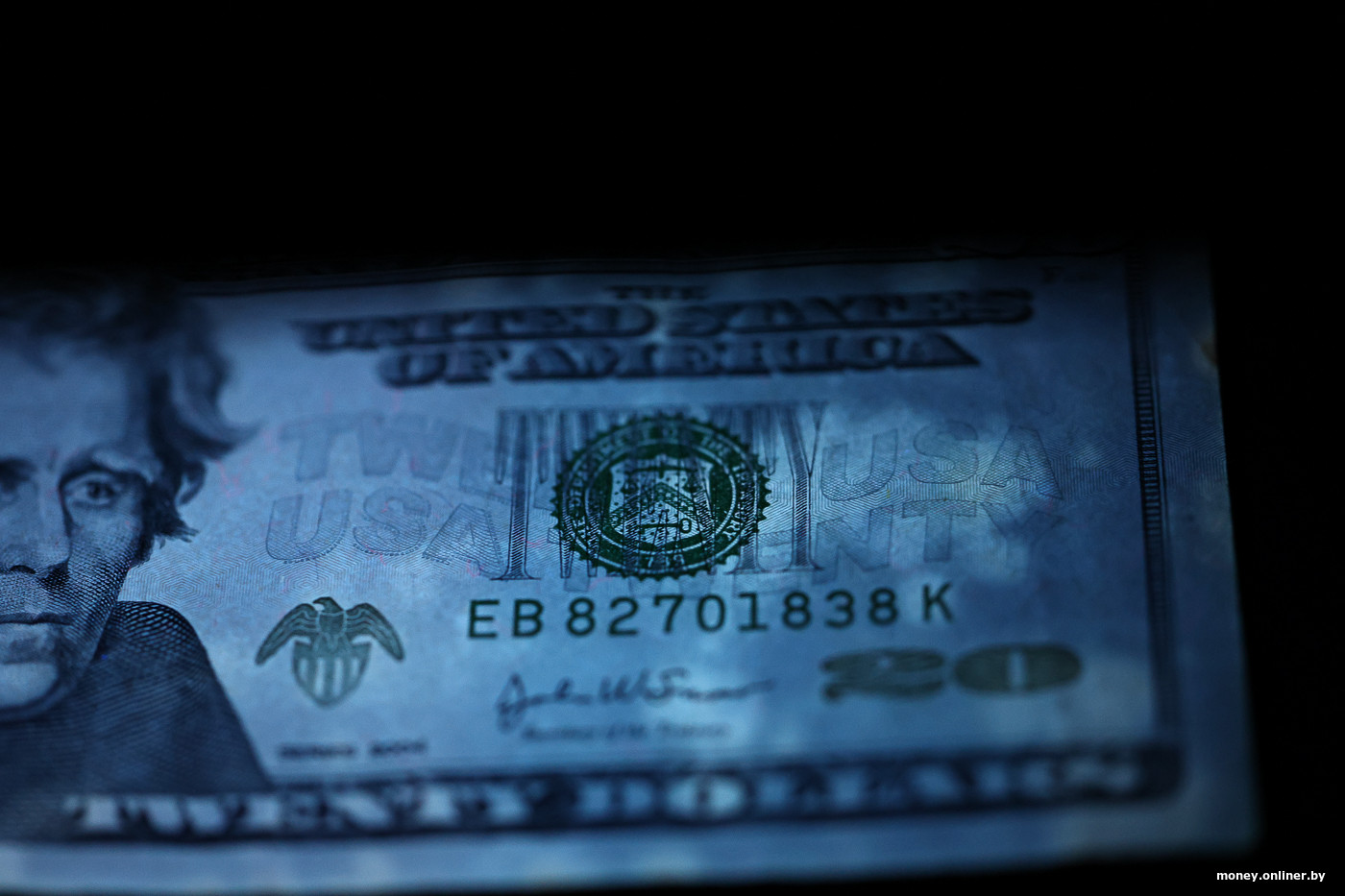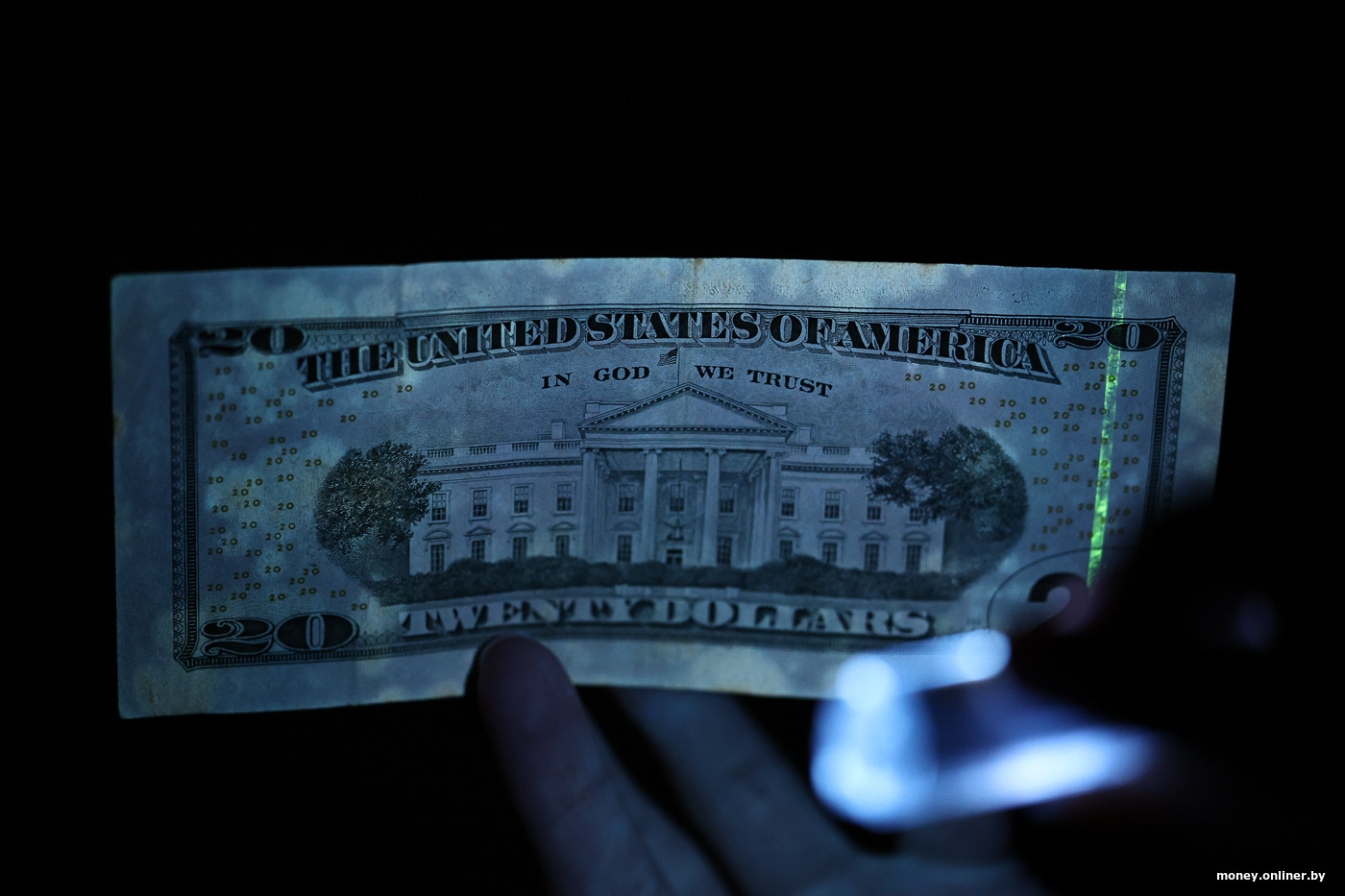 Некоторый визуальный ориентир есть, теперь достаем из конверта «грязную» двадцатку и тоже светим сначала УФ-фонариком. Картина совсем другая, почти дискотека.