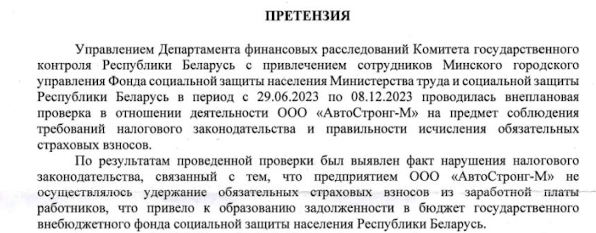 «АвтоСтронг-М» в своем письме указывает, что в 2023 году в компанию действительно приходила внеплановая проверка Департамента финансовых расследований Комитета госконтроля с привлечением сотрудников минского управления ФСЗН «на предмет соблюдения требований налогового законодательства и правильности исчисления обязательных страховых взносов».