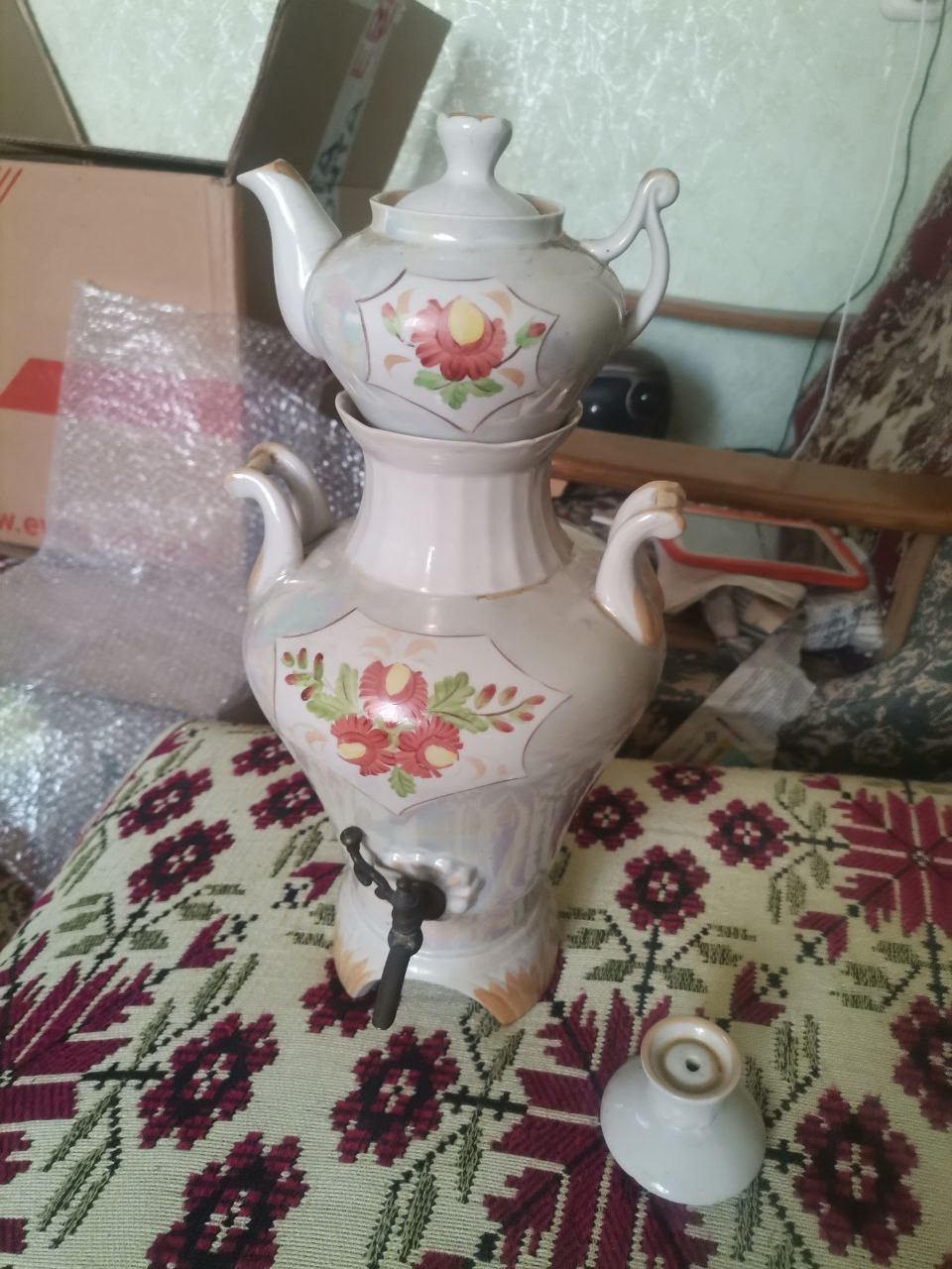 Электрический фарфоровый самовар с чайником, СССР. Стоимость такого изделия варьируется в диапазоне 100—130 рублей.