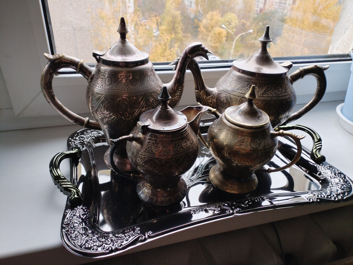 — На фото представлен набор для кофе и чая: кофейник, чайник, сливочник, сахарница и поднос. Изделия, вероятнее всего, посеребренные, декорированные нарезкой в ориентальном стиле. При хорошей сохранности и отсутствии дефектов, не позволяющих использовать предметы по их прямому назначению, такой набор стоит в диапазоне от 400 до 700 рублей.