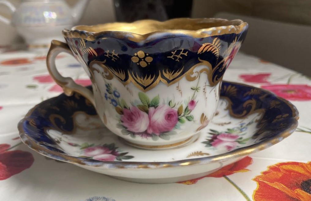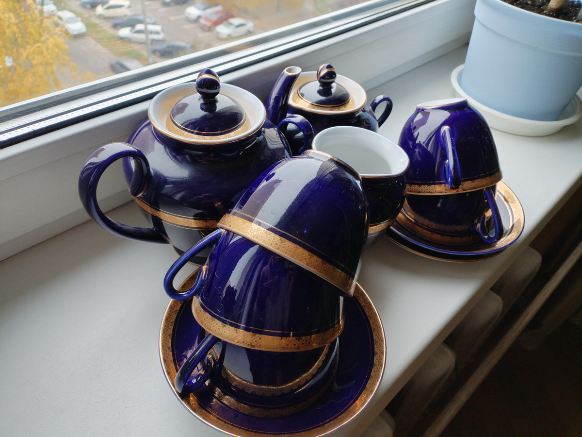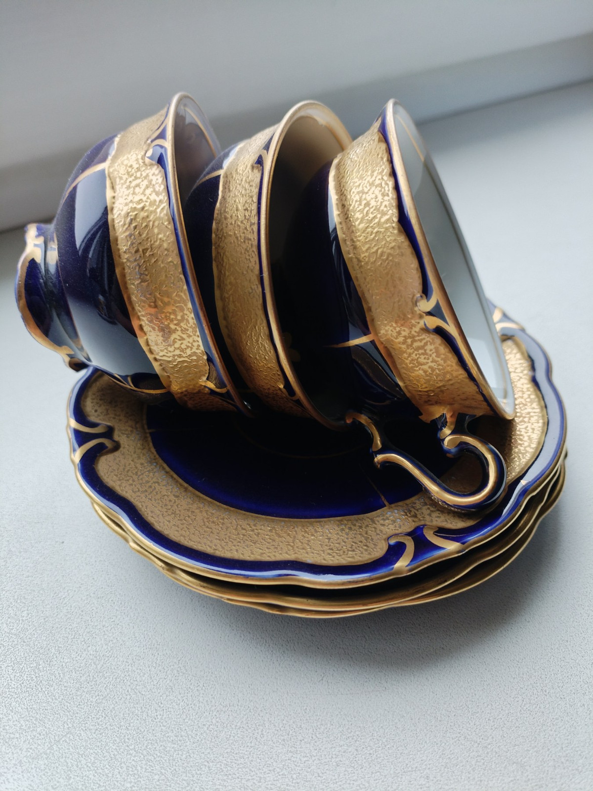 — Винтажные чайные (кофейные) пары, предположительно, немецкой мануфактуры Ilmenau, 1950-е годы, кобальт, золочение. Стоимость одной пары — от 50—70 рублей.
