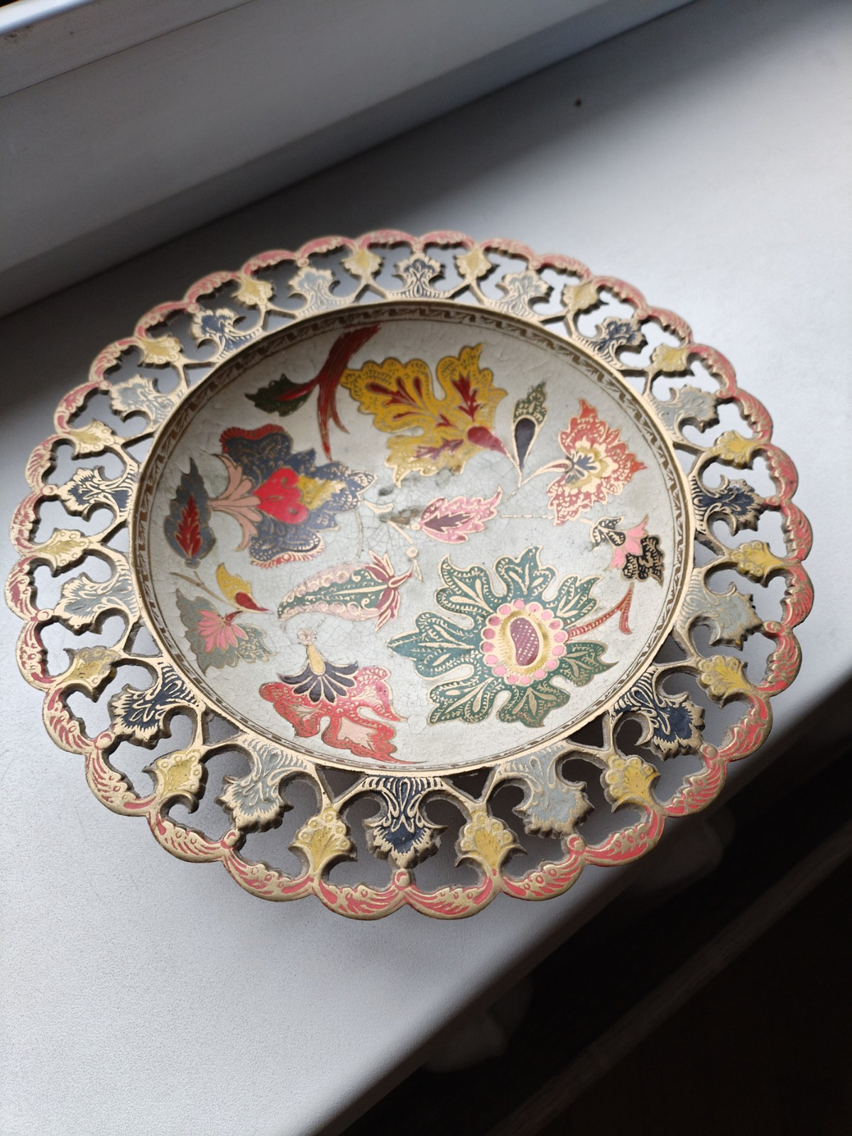 — Судя по всему, на фото латунная тарелка с декорированием эмалью, Индия. Стоимость таких тарелок (сухарниц) составляет 90—120 рублей.