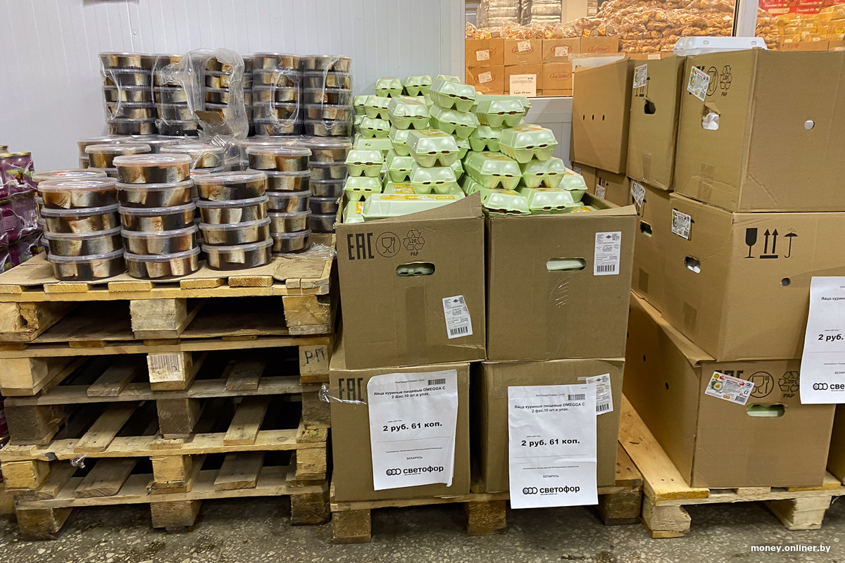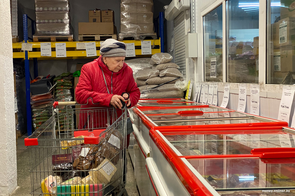 Мы дошли до морозильных ларей — отмечаем в них минтай по 7 рублей за килограмм и небольшие креветки по 17. Есть форель, белорусская индейка, голубцы в виде полуфабрикатов, фарш, замороженное ведро мяса для гриля. На глаза попадается несколько поврежденных упаковок заморозки, при этом сроки годности на этикетках в порядке.