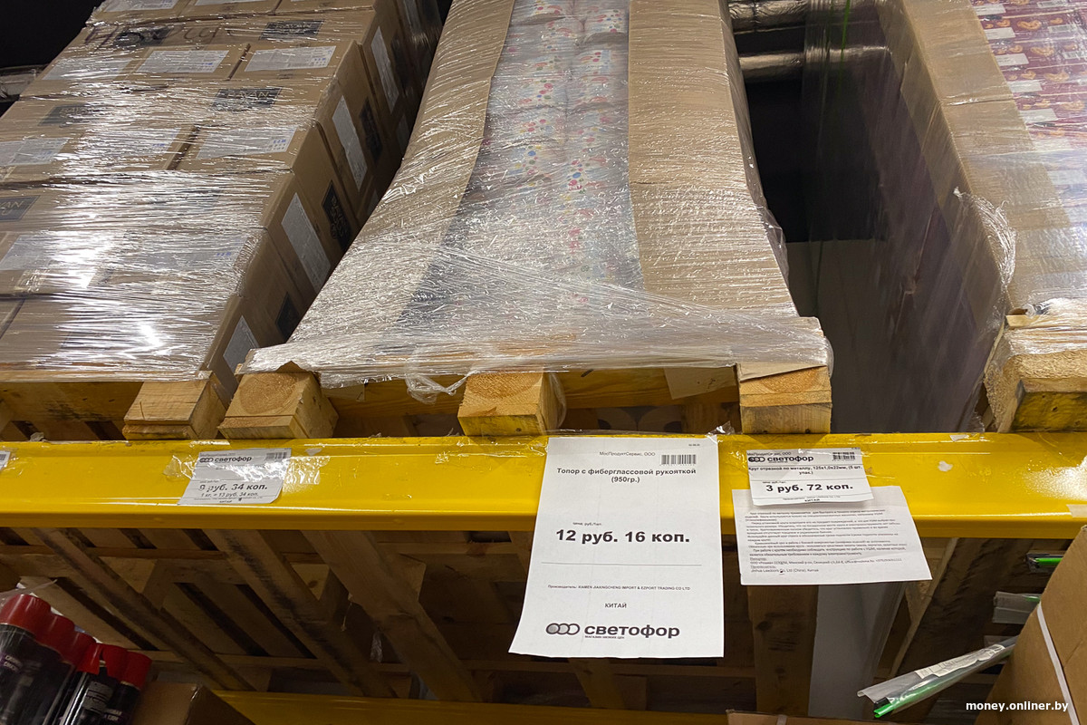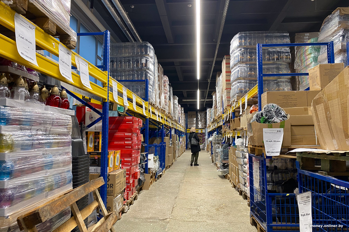 Бетонный пол, выкладка напоминает складскую: полки из палет и металлических решеток, товар стоит прямо в коробках. Можно увидеть оптовые объемы и запас продукции прямо на месте. Например, вверху стеллажа прячется стратегический резерв туалетной бумаги.