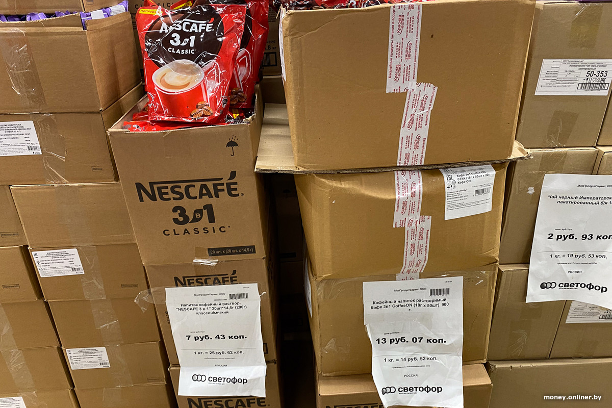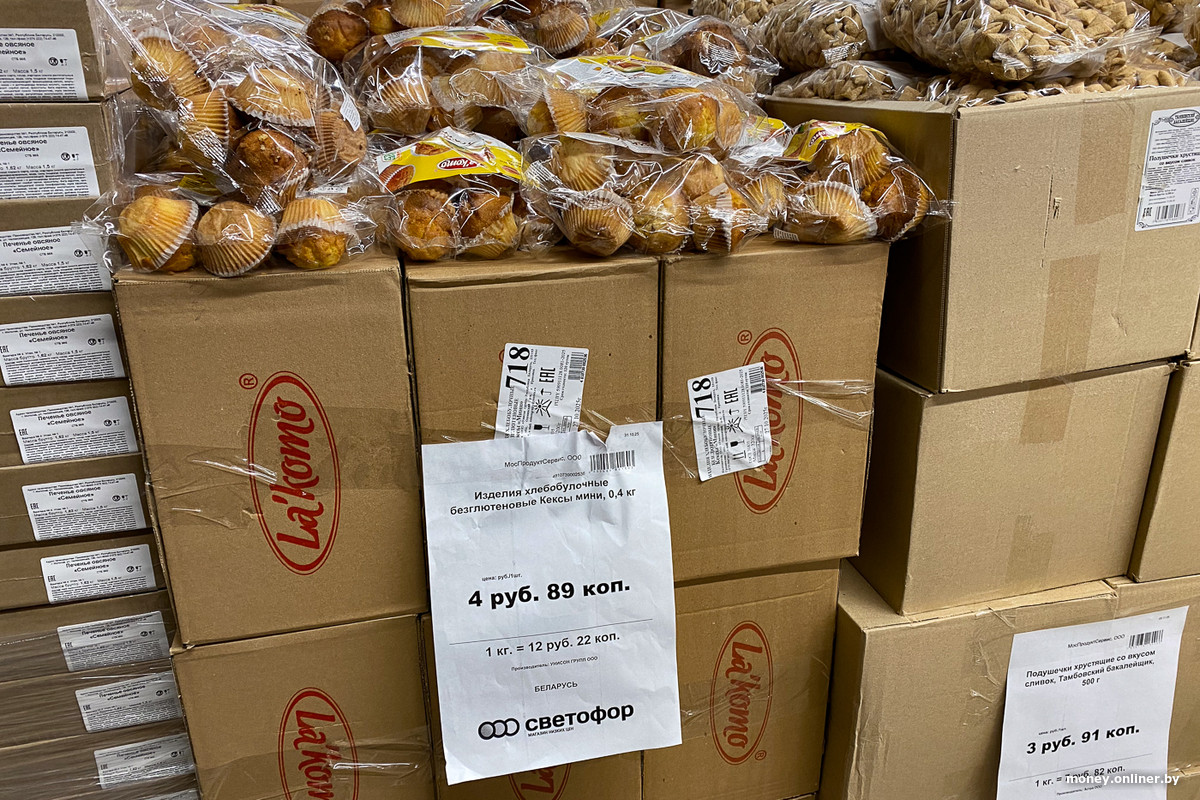 Уже за пределами холода новые стопки еды — российские консервы соседствуют с лапшой из Кыргызстана и белорусскими макаронами. Напротив — польские яблоки по 4,03 рубля за килограмм, чуть дальше — белорусский уксус и российские специи.