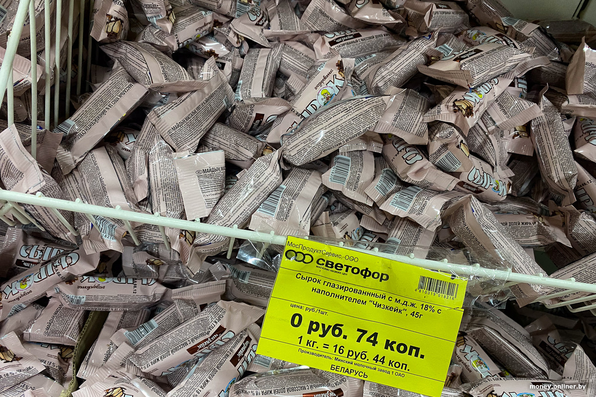 Радом находится комната-холодильник — вместо двери у нее прозрачные жалюзи из материала, на ощупь похожего на винил. Помещение довольно большое — пять человек могут ходить по нему, не мешая друг другу. Покупатели, кстати, тут не задерживаются: все же в холодный сезон хочется быстро взять нужное и выйти в тепло. На этих полках не так много брендов, знакомых по рекламе на билбордах, но в ассортименте много белорусского — например, колбасы из Могилева, Слуцка, Глубокого. Сырок можно найти за 69 копеек, соевый соус — за 1,84 рубля, десяток яиц — за 2,61.