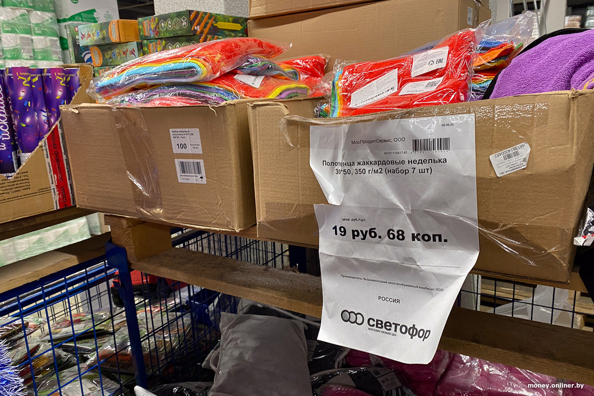 На входе в торговый зал нас встречает текстиль: мужское и женское нижнее белье, носки по три пары, полотенца, небольшие рулоны плюшевых пледов. Внимание привлекает набор полотенец «Неделька», который состоит из семи штук разных цветов, подписанных буднями и выходными.