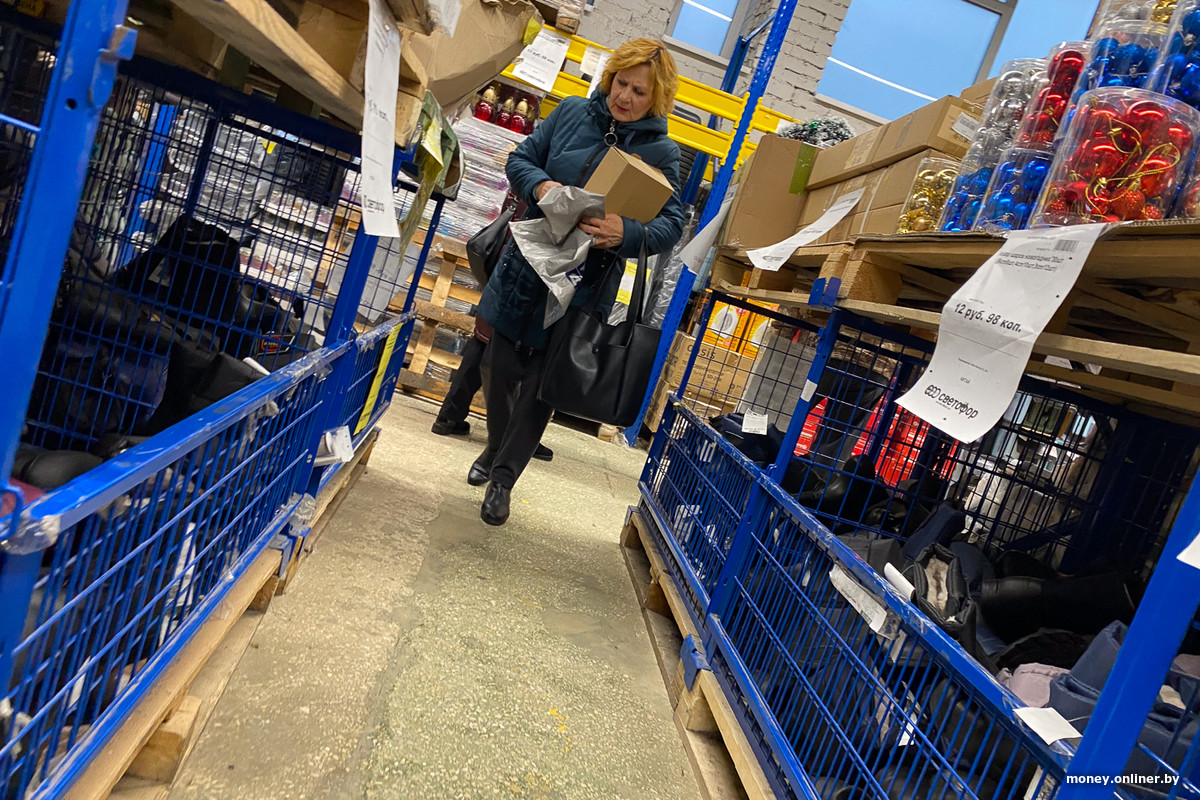 Зал построен по логике «от промтоваров к продуктам» — больше всего покупателей встречаем возле еды. Вот мужчина выбирает газировку из горки ярких бутылок. А вот в тележке женщины мимо проезжают сушки и крупы. Еще одна покупательница пришла за майонезом и тряпками для уборки. Уловом следующей становятся два рулона новогодней упаковки.