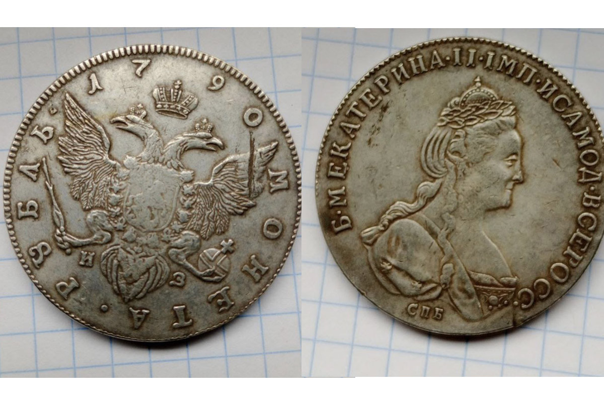 — Представленная монета — грубая современная подделка рубля 1790 года, выполненная в имитации антикварного серебряного чекана эпохи Екатерины II. Подобные копии массово производятся в наше время и не имеют нумизматической ценности: металл, вес и детали рисунка существенно отличаются от оригинала.