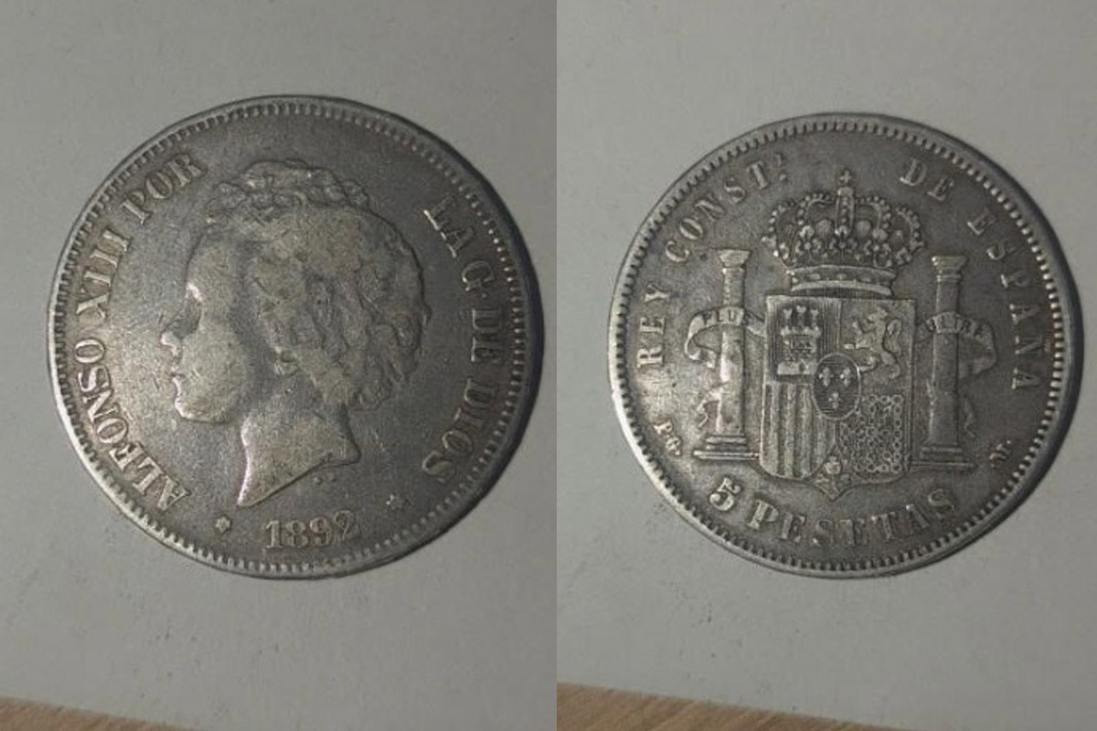 — Серебряная монета Испании номиналом 5 песет 1892 года, с портретом короля Альфонсо XIII в детском возрасте. Чеканилась из серебра 900-й пробы, вес — около 25 граммов. Эти монеты выпускались большими тиражами и долго находились в обращении, поэтому встречаются нередко. В представленном виде такая монета оценивается примерно в 100 рублей.