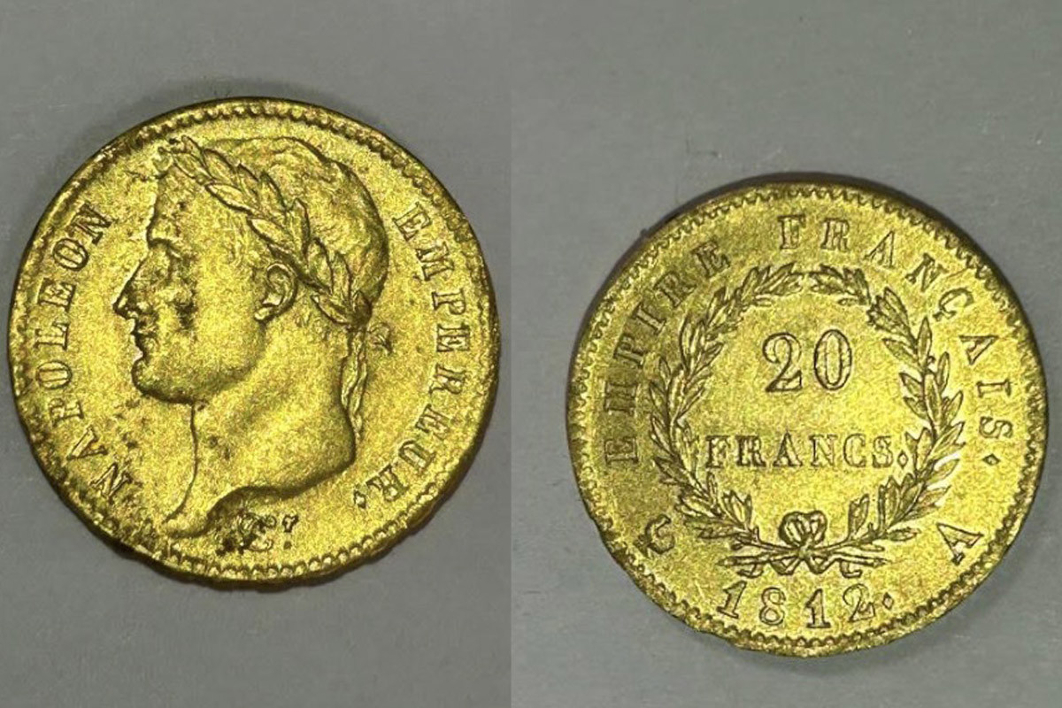 — Золотая монета Франции номиналом 20 франков 1812 года, чеканенная в Париже, известна как «наполеондор». На аверсе изображен профиль императора Наполеона I, на реверсе — венок и номинал. Монета весит около 6,45 грамма и содержит 5,8 грамма чистого золота 900-й пробы. Эти выпуски не редки, но ценятся за историческую значимость и инвестиционную привлекательность. Стоимость данной монеты может быть около 1000—1200 долларов.