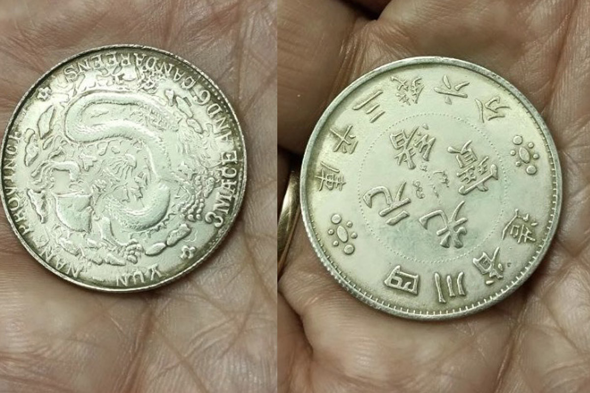 — Серебряная монета Китая — так называемый провинциальный доллар провинции Юньнань, чеканившийся в период между 1908 и 1911 годами. На аверсе традиционно изображен дракон, на реверсе — надписи с указанием номинала и провинции. Эти монеты выпускались из серебра 900-й пробы и имели вес около 26,8 грамма. При подлинности их стоимость составляет порядка 400—500 рублей, однако рынок подобных монет сильно переполнен антикварными подделками, производимыми в самом Китае. Из-за высокого качества этих копий без экспертизы или проверки монеты вживую определить ее подлинность по фотографии невозможно.