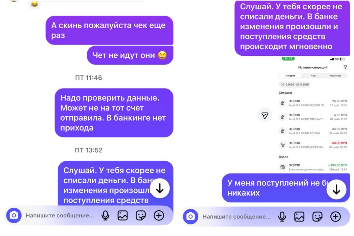 — Девушка была приятная, веселая, общительная. Я сделала свою работу, она попросила провести оплату через ЕРИП. Я предоставила ей все данные и, так как спешила, отпустила ее — мы договорились, что ее муж оплатит и сбросит мне чек. Спустя время оплаты не поступило. Я ей написала, девушка ответила, что муж вот-вот переведет оплату… и пропала.