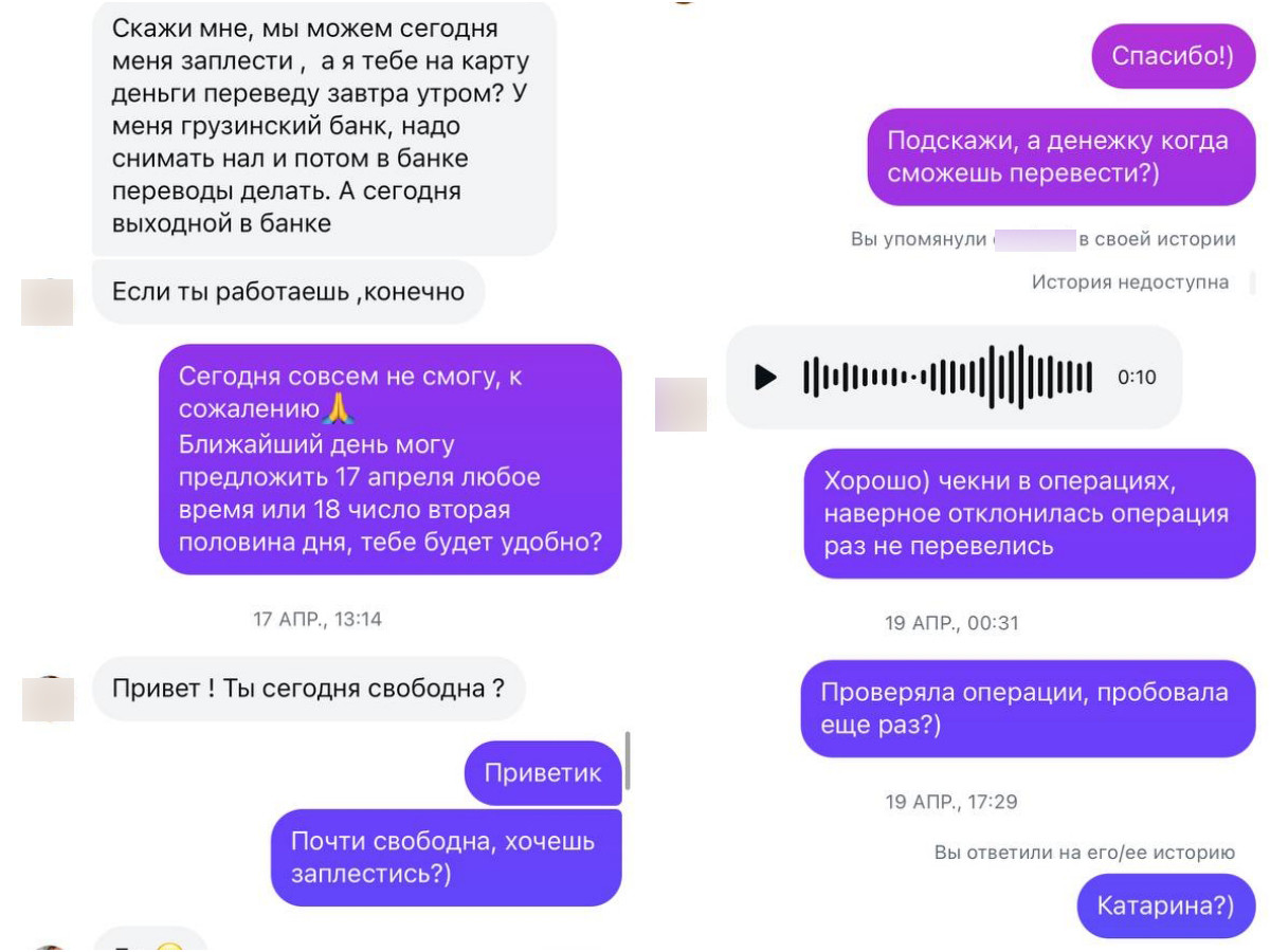 Но еще до того, как Диана прочитала отзывы в Threads, она успела заплести девушку второй раз. Екатерина тогда просила заплести ее и написала, что оплатит услугу на следующее утро, объяснив это сложностями с грузинским банком. Девушка была доброжелательной, делилась историями из своей жизни и никаких подозрений тогда у мастера не вызвала.