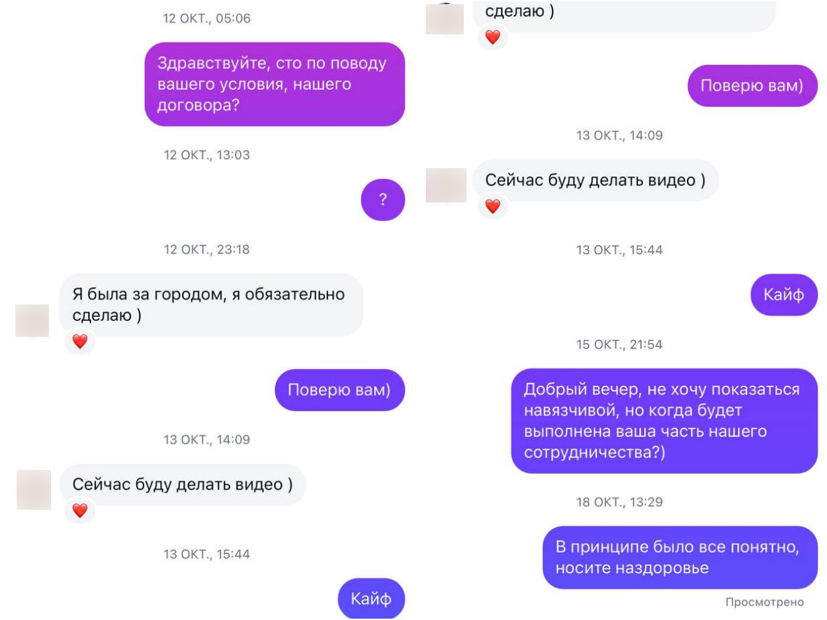 На следующее утро Екатерина вышла на связь сама и прислала чек — правда, это было исчезающее сообщение в Instagram. Наталья успела открыть его, но само фото не сохранилось.