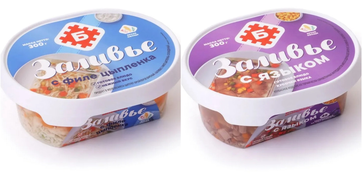 Кетчунезом уже никого не удивить, «Брестский мясокомбинат» шагнул дальше и придумал продукт с намеком на два популярных народных блюда сразу — заливное и оливье. В «Заливье» привычная желейная структура, овощи и мясо — в линейке сейчас два варианта, с языком и с филе цыпленка. Продукт, кстати, низкокалорийный — на 100 грамм всего 45 ккал.